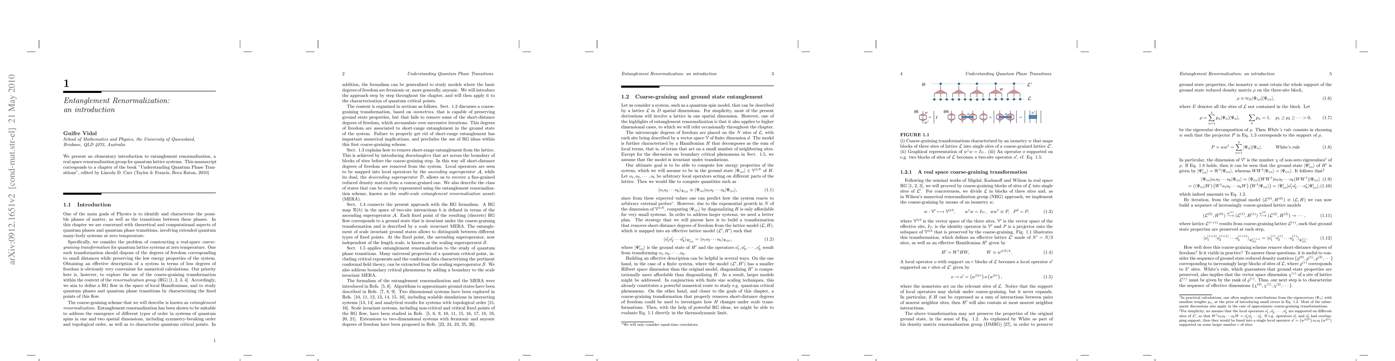 **Summary:** This paper provides a fundamental introduction to entanglement renormalization, focusing on its application as a real-space renormalization group method for analyzing quantum lattice systems, particularly in the context of understanding quantum phase transitions. **Source:** Chapter in "Understanding Quantum Phase Transitions" edited by Lincoln D. Carr (2010).
