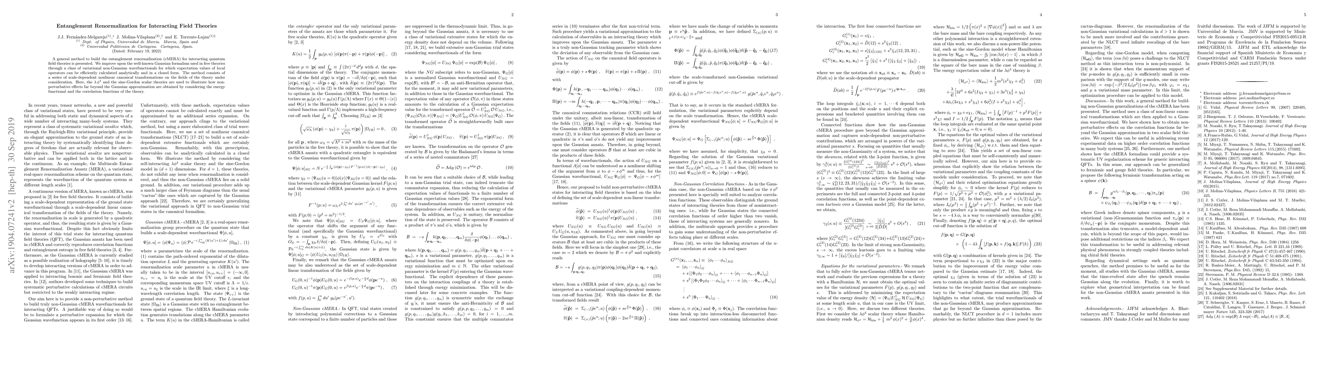 This paper presents a method for entanglement renormalization in interacting quantum field theories, improving upon Gaussian approximations with non-Gaussian variational wavefunctionals. The method employs scale-dependent transformations to capture non-perturbative effects, demonstrated through $\lambda\, \phi^4$ and sine-Gordon models.