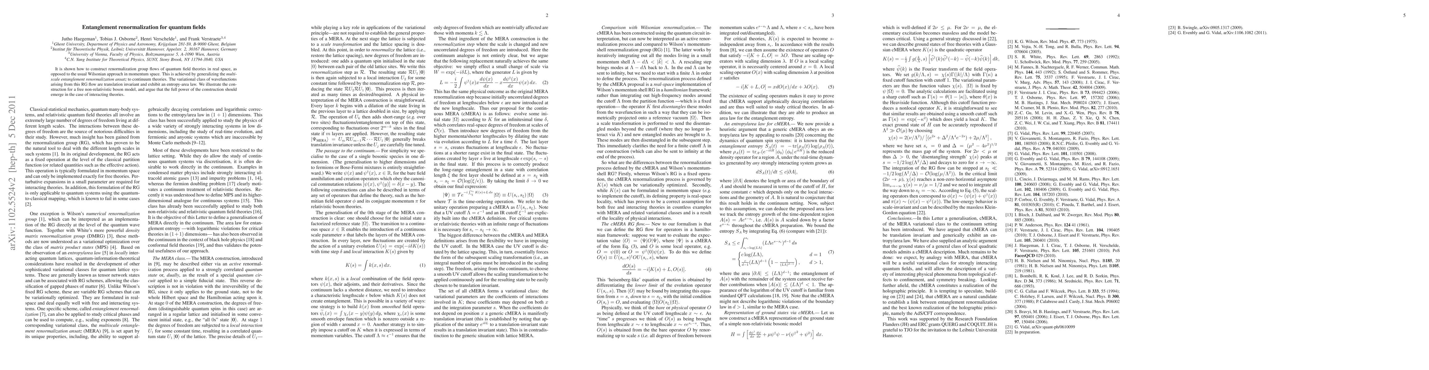 This paper constructs renormalization group flows for quantum field theories in real space, generalizing the multiscale entanglement renormalization ansatz to continuum theories. The resulting wavefunctions are translation invariant and exhibit an entropy-area law, demonstrated through a free non-relativistic boson model, with potential for broader application to interacting theories.