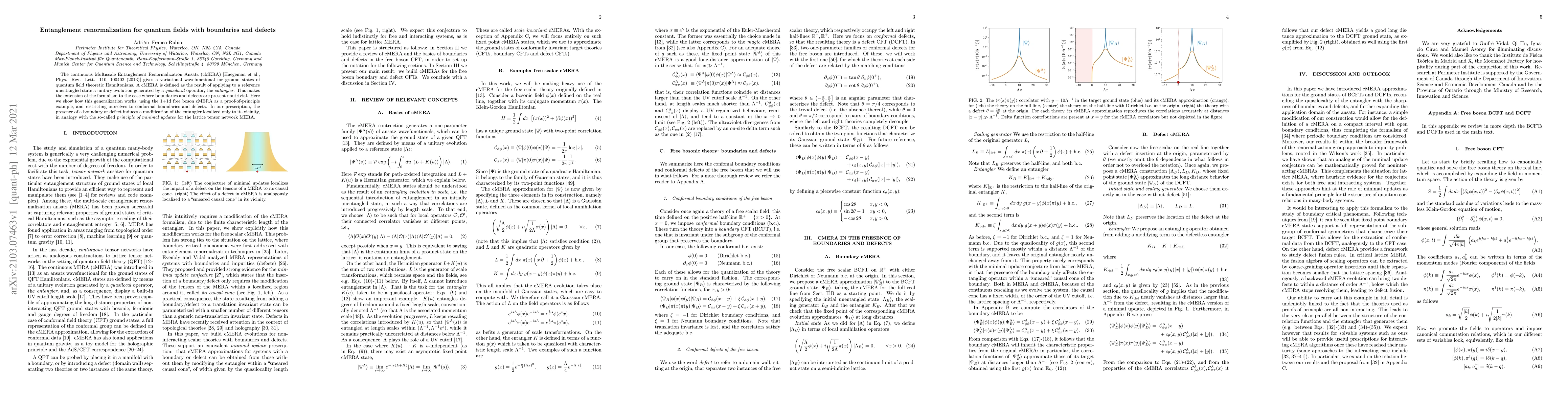This paper extends the continuous Multiscale Entanglement Renormalization Ansatz (cMERA) to quantum field theories with boundaries and defects, demonstrating the method using a 1+1d free boson cMERA. The approach modifies the entangler near the boundary or defect, adhering to the principle of minimal updates.