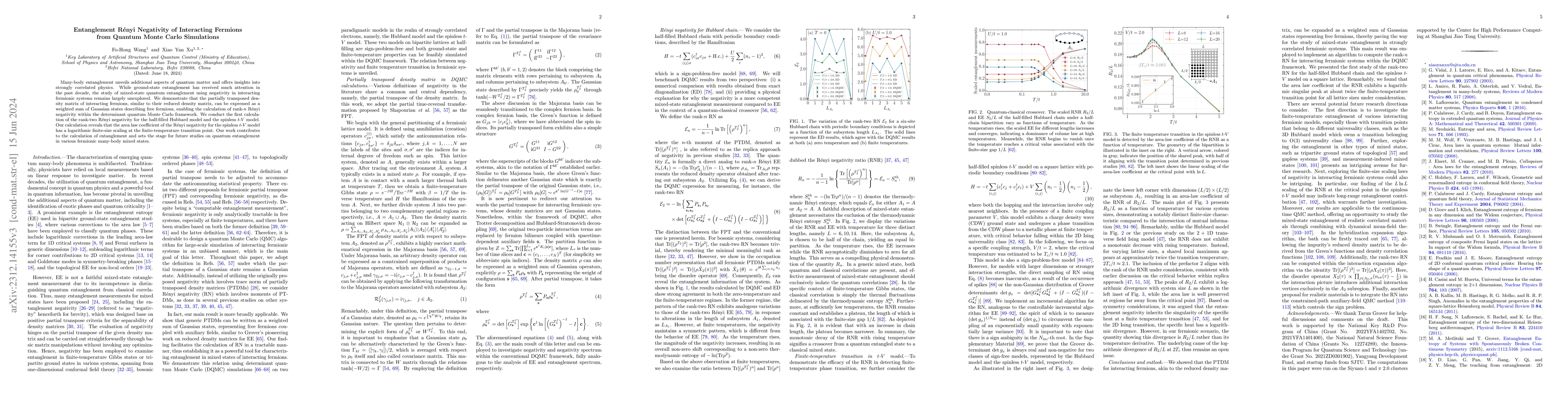 Many-body entanglement unveils additional aspects of quantum matter and offers insights into strongly correlated physics. While ground-state entanglement has received much attention in the past decade, the study of mixed-state quantum entanglement using negativity in interacting fermionic systems remains largely unexplored. We demonstrate that the partially transposed density matrix of interacting fermions, similar to their reduced density matrix, can be expressed as a weighted sum of Gaussian states describing free fermions, enabling the calculation of rank-$n$ R\'{e}nyi negativity within the determinant quantum Monte Carlo framework. We conduct the first calculation of the rank-two R\'{e}nyi negativity for the half-filled Hubbard model and the spinless $t$-$V$ model. Our calculation reveals that the area law coefficient of the R\'{e}nyi negativity for the spinless $t$-$V$ model has a logarithmic finite-size scaling at the finite-temperature transition point. Our work contributes to the calculation of entanglement and sets the stage for future studies on quantum entanglement in various fermionic many-body mixed states.