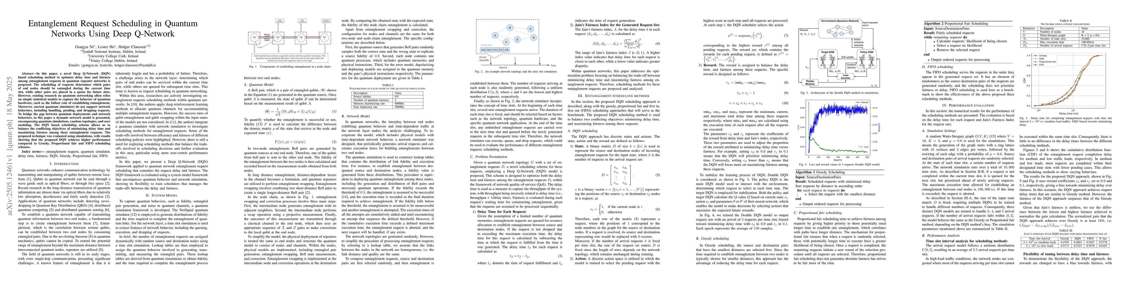 A new Deep Q-Network scheduling method optimizes delay time and fairness in quantum networks by balancing conflicting objectives, achieving better performance than traditional schemes in simulations.