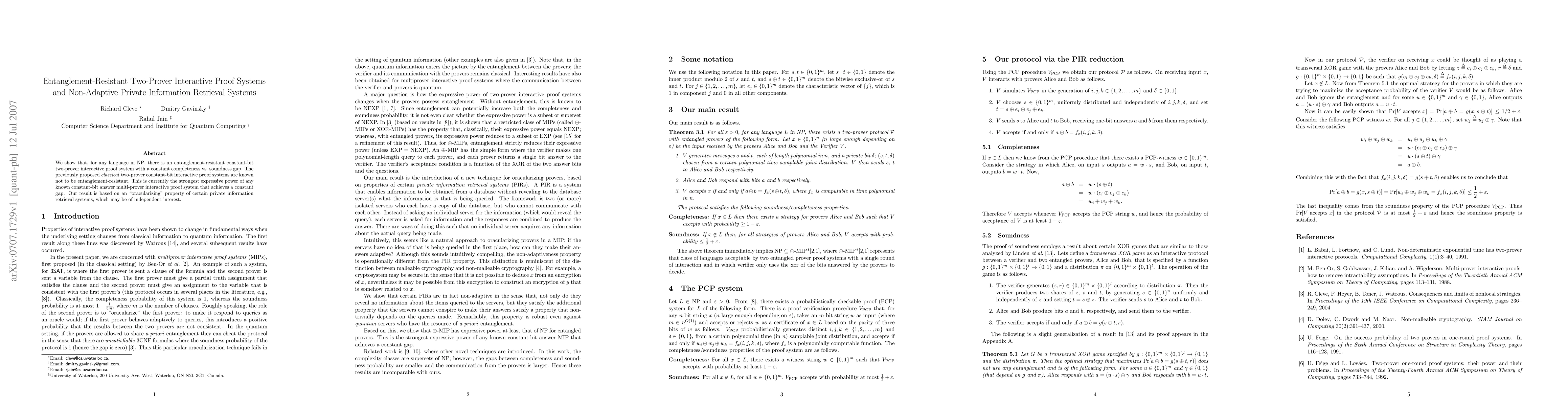 This paper presents an entanglement-resistant constant-bit two-prover interactive proof system for any language in NP, achieving a constant completeness vs. soundness gap. The result is based on an "oracularizing" property of non-adaptive private information retrieval systems, which may also be valuable independently.