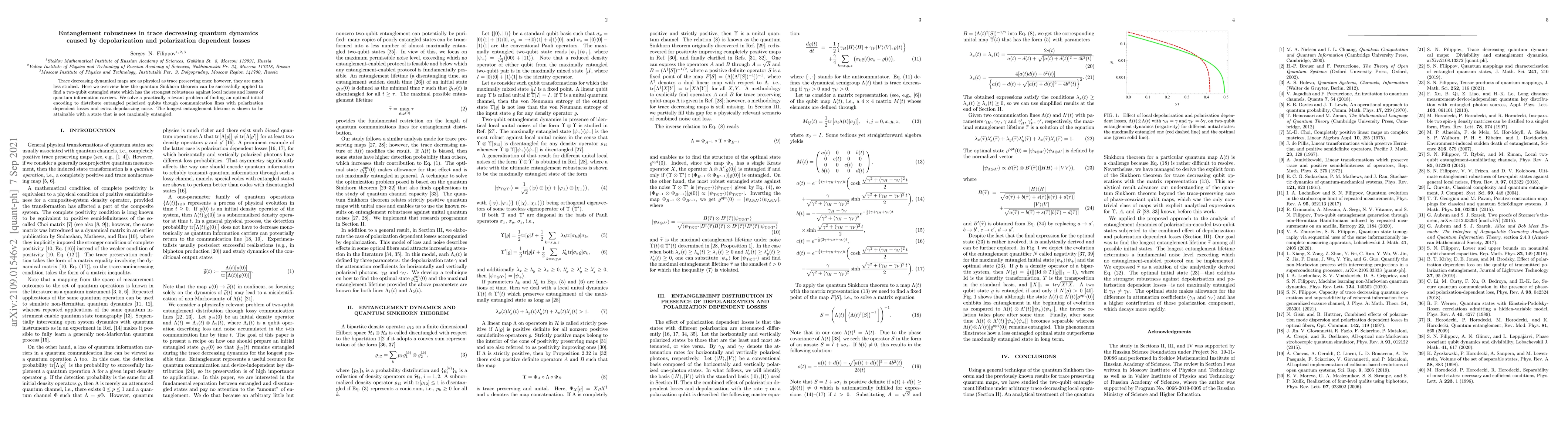 Trace decreasing dynamical maps are as physical as trace preserving ones; however, they are much less studied. Here we overview how the quantum Sinkhorn theorem can be successfully applied to find a two-qubit entangled state which has the strongest robustness against local noises and losses of quantum information carriers. We solve a practically relevant problem of finding an optimal initial encoding to distribute entangled polarized qubits though communication lines with polarization dependent losses and extra depolarizing noise. The longest entanglement lifetime is shown to be attainable with a state that is not maximally entangled.