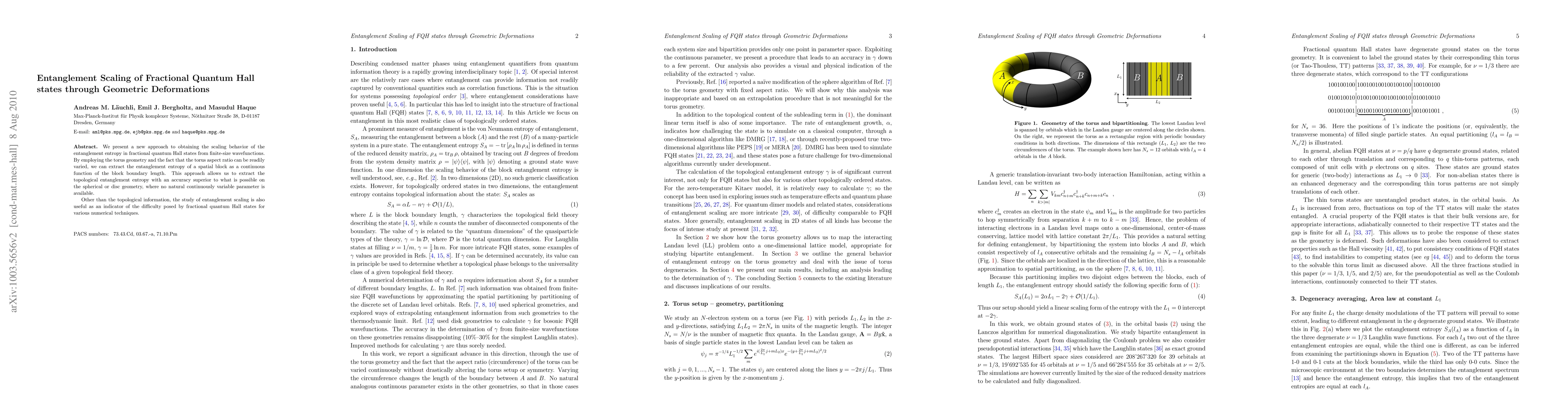 This paper introduces a novel method to determine the scaling behavior of entanglement entropy in fractional quantum Hall states using geometric deformations on the torus. The study reveals superior accuracy in extracting topological entanglement entropy compared to spherical or disc geometries, and highlights the method's utility in assessing the complexity of these states for numerical techniques.