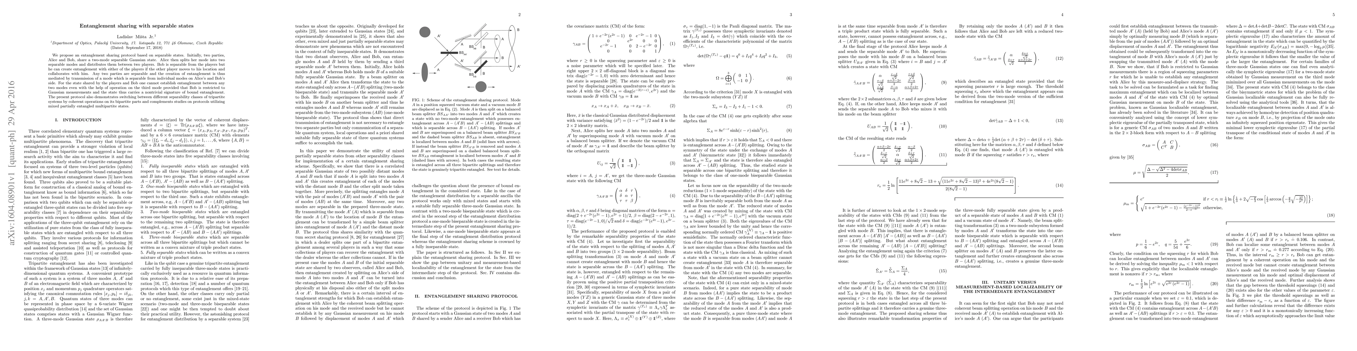 We propose an entanglement sharing protocol based on separable states. Initially, two parties, Alice and Bob, share a two-mode separable Gaussian state. Alice then splits her mode into two separable modes and distributes them between two players. Bob is separable from the players but he can create entanglement with either of the players if the other player moves to his location and collaborates with him. Any two parties are separable and the creation of entanglement is thus mediated by transmission of a mode which is separable from individual modes on Alice's and Bob's side. For the state shared by the players and Bob one cannot establish entanglement between any two modes even with the help of operation on the third mode provided that Bob is restricted to Gaussian measurements and the state thus carries a nontrivial signature of bound entanglement. The present protocol also demonstrates switching between different separability classes of tripartite systems by coherent operations on its bipartite parts and complements studies on protocols utilizing mixed partially entangled multipartite states.