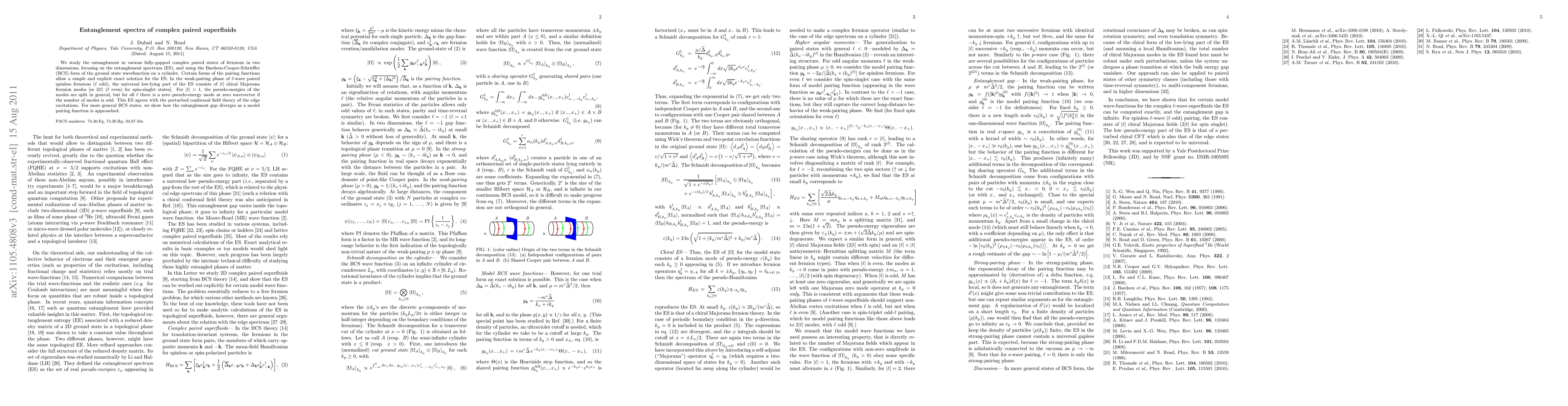 We study the entanglement in various fully-gapped complex paired states of fermions in two dimensions, focusing on the entanglement spectrum (ES), and using the BCS form of the ground state wavefunction on a cylinder. Certain forms of the pairing functions allow a simple and explicit exact solution for the ES. In the weak-pairing phase of l-wave paired spinless fermions (l odd), the universal low-lying part of the ES consists of |l| chiral Majorana fermion modes [or 2|l| (l even) for spin-singlet states]. For |l|>1, the pseudo-energies of the modes are split in general, but for all l there is a zero--pseudo-energy mode at zero wavevector if the number of modes is odd. This ES agrees with the perturbed conformal field theory of the edge excitations. For more general BCS states, we show how the entanglement gap diverges as a model pairing function is approached.