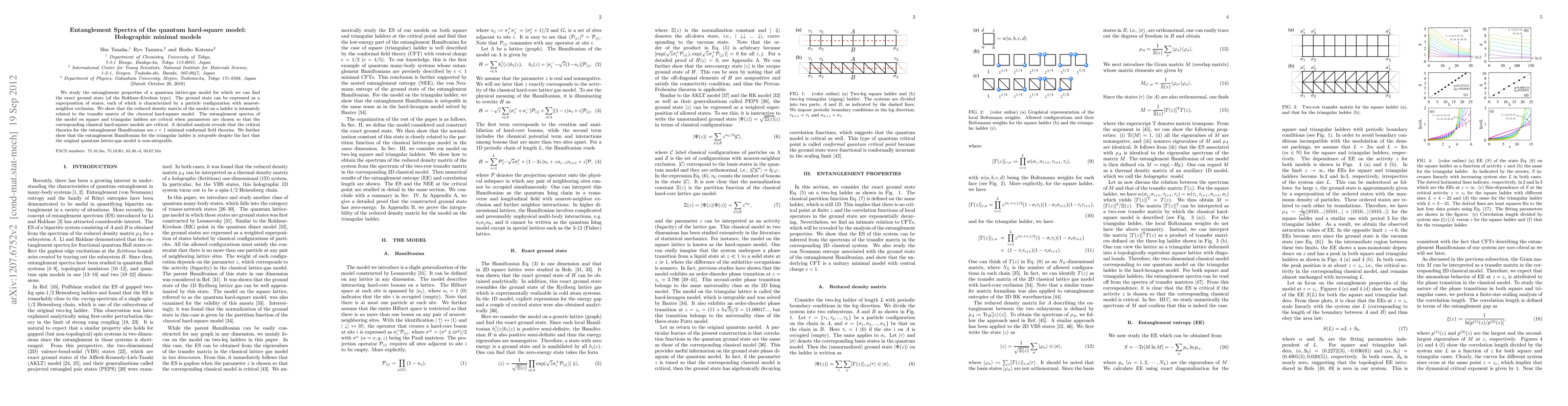 We study the entanglement properties of a quantum lattice-gas model for which we can find the exact ground state (of the Rokhsar-Kivelson type). The ground state can be expressed as a superposition of states, each of which is characterized by a particle configuration with nearest-neighbor exclusion. We show that the reduced density matrix of the model on a ladder is intimately related to the transfer matrix of the classical hard-square model. The entanglement spectra of the model on square and triangular ladders are critical when parameters are chosen so that the corresponding classical hard-square models are critical. A detailed analysis reveals that the critical theories for the entanglement Hamiltonians are $c<1$ minimal conformal field theories. We further show that the entanglement Hamiltonian for the triangular ladder is integrable despite the fact that the original quantum lattice-gas model is non-integrable.