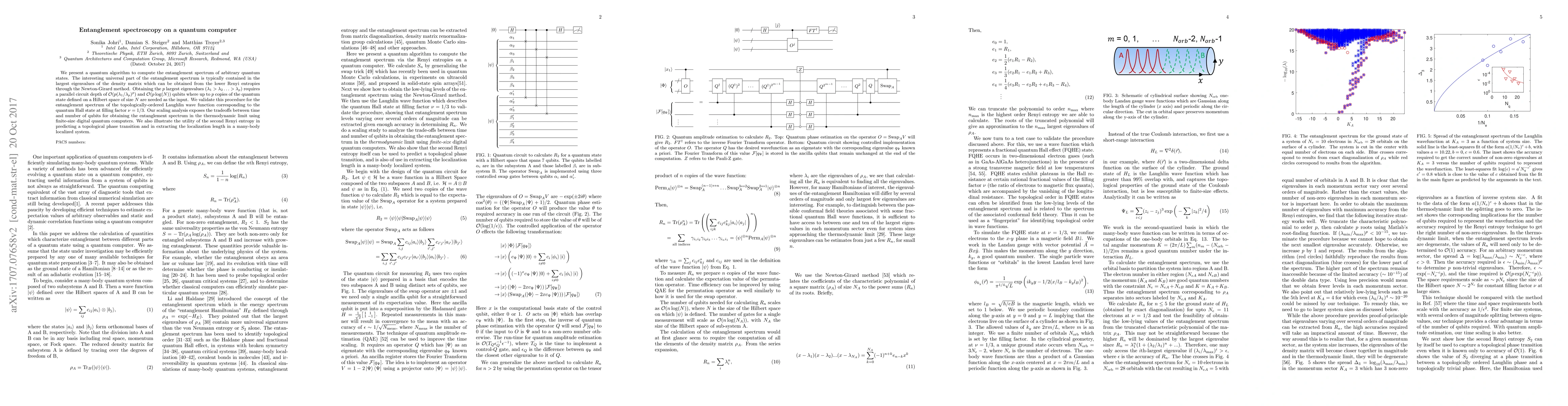 We present a quantum algorithm to compute the entanglement spectrum of arbitrary quantum states. The interesting universal part of the entanglement spectrum is typically contained in the largest eigenvalues of the density matrix which can be obtained from the lower Renyi entropies through the Newton-Girard method. Obtaining the $p$ largest eigenvalues ($\lambda_1>\lambda_2\ldots>\lambda_p$) requires a parallel circuit depth of $\mathcal{O}(p(\lambda_1/\lambda_p)^p)$ and $\mathcal{O}(p\log(N))$ qubits where up to $p$ copies of the quantum state defined on a Hilbert space of size $N$ are needed as the input. We validate this procedure for the entanglement spectrum of the topologically-ordered Laughlin wave function corresponding to the quantum Hall state at filling factor $\nu=1/3$. Our scaling analysis exposes the tradeoffs between time and number of qubits for obtaining the entanglement spectrum in the thermodynamic limit using finite-size digital quantum computers. We also illustrate the utility of the second Renyi entropy in predicting a topological phase transition and in extracting the localization length in a many-body localized system.