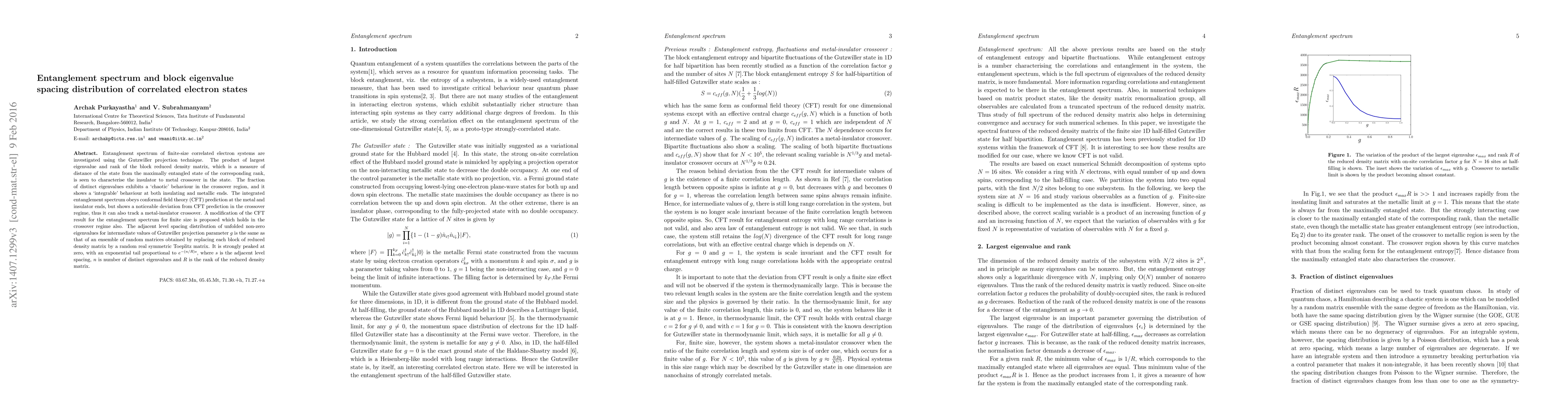 Entanglement spectrum of finite-size correlated electron systems are investigated using the Gutzwiller projection technique. The product of largest eigenvalue and rank of the block reduced density matrix, which is a measure of distance of the state from the maximally entangled state of the corresponding rank, is seen to characterise the insulator to metal crossover in the state. The fraction of distinct eigenvalues exhibits a `chaotic' behaviour in the crossover region, and it shows a `integrable' behaviour at both insulating and metallic ends. The integrated entanglement spectrum obeys conformal field theory (CFT) prediction at the metal and insulator ends, but shows a noticeable deviation from CFT prediction in the crossover regime, thus it can also track a metal-insulator crossover. A modification of the CFT result for the entanglement spectrum for finite size is proposed which holds in the crossover regime also. The adjacent level spacing distribution of unfolded non-zero eigenvalues for intermediate values of Gutzwiller projection parameter $g$ is the same as that of an ensemble of random matrices obtained by replacing each block of reduced density matrix by a random real symmetric Toeplitz matrix. It is strongly peaked at zero, with an exponential tail proportional to $e^{-(n/R)s}$, where $s$ is the adjacent level spacing, $n$ is number of distinct eigenvalues and $R$ is the rank of the reduced density matrix.