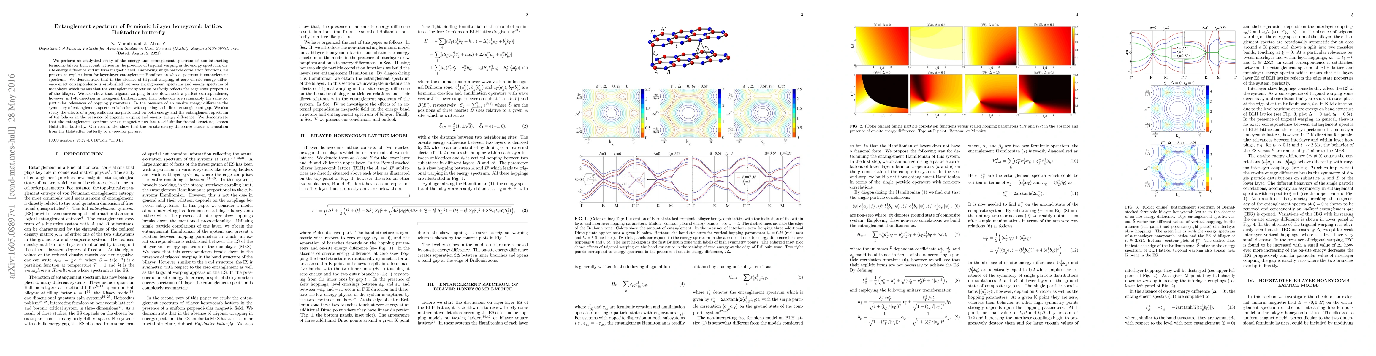 We perform an analytical study of the energy and entanglement spectrum of non-interacting fermionic bilayer honeycomb lattices in the presence of trigonal warping in the energy spectrum, on-site energy difference and uniform magnetic field. Employing single particle correlation functions, we present an explicit form for layer-layer entanglement Hamiltonian whose spectrum is entanglement spectrum. We demonstrate that in the absence of trigonal warping, at zero on-site energy difference exact correspondence is established between entanglement spectrum and energy spectrum of monolayer which means that the entanglement spectrum perfectly reflects the edge state properties of the bilayer. We also show that trigonal warping breaks down such a perfect correspondence, however, in $\Gamma$-K direction in hexagonal Brillouin zone, their behaviors are remarkably the same for particular relevances of hopping parameters. In the presence of an on-site energy difference the symmetry of entanglement spectrum is broken with opening an indirect entanglement gap. We also study the effects of a perpendicular magnetic field on both energy and the entanglement spectrum of the bilayer in the presence of trigonal warping and on-site energy difference. We demonstrate that the entanglement spectrum versus magnetic flux has a self similar fractal structure, known Hofstadter butterfly. Our results also show that the on-site energy difference causes a transition from the Hofstadter butterfly to a tree-like picture.