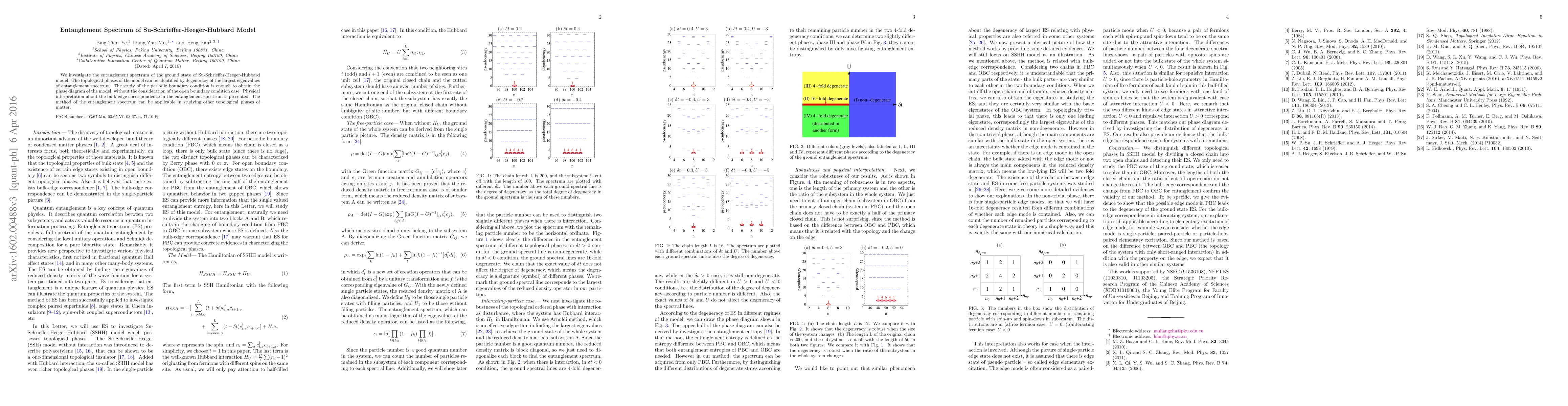 This paper explores the entanglement spectrum of the Su-Schrieffer-Heeger-Hubbard model to identify its topological phases, showing that the largest eigenvalue degeneracies reveal these phases. The study finds that the periodic boundary condition suffices to determine the phase diagram, highlighting the bulk-edge correspondence in the entanglement spectrum.