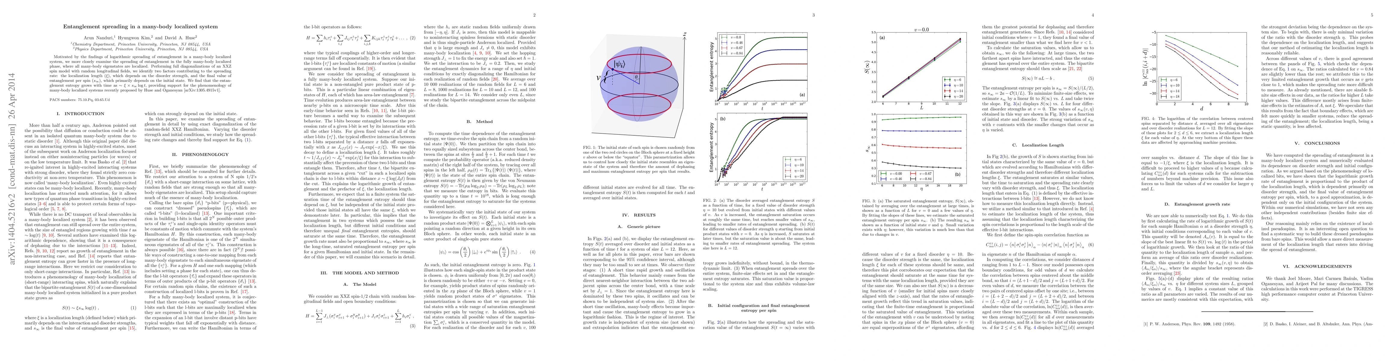 Motivated by the findings of logarithmic spreading of entanglement in a many-body localized system, we more closely examine the spreading of entanglement in the fully many-body localized phase, where all many-body eigenstates are localized. Performing full diagonalizations of an XXZ spin model with random longitudinal fields, we identify two factors contributing to the spreading rate: the localization length ($\xi$), which depends on the disorder strength, and the final value of entanglement per spin ($s_\infty$), which primarily depends on the initial state. We find that the entanglement entropy grows with time as $\sim \xi \times s_\infty \log t$, providing support for the phenomenology of many-body localized systems recently proposed by Huse and Oganesyan [arXiv:1305.4915v1].