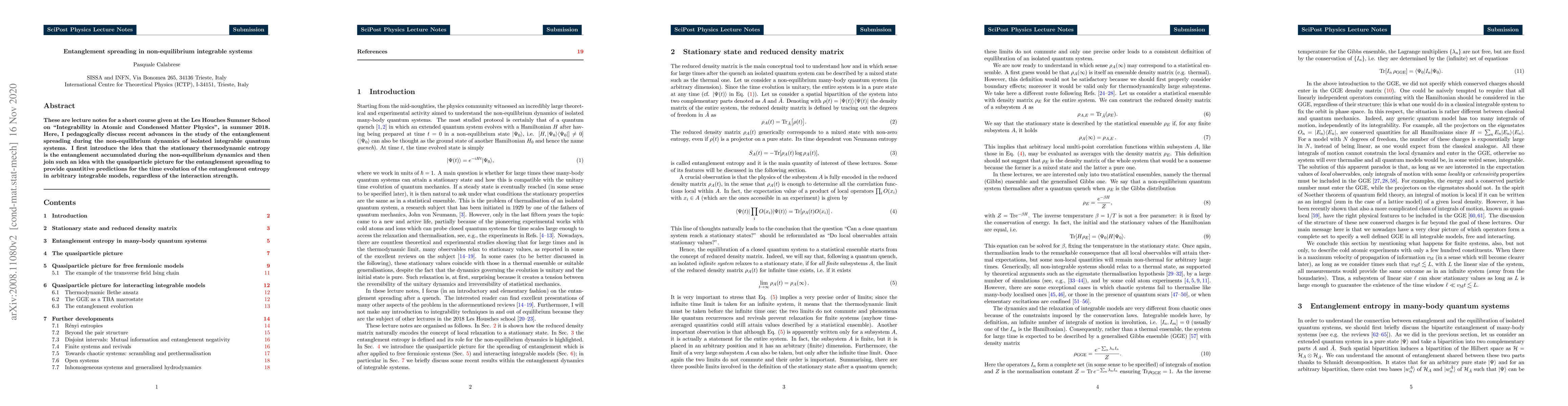This paper presents lecture notes on entanglement spreading in isolated integrable quantum systems during non-equilibrium dynamics. It introduces the concept of stationary thermodynamic entropy as accumulated entanglement and combines it with the quasiparticle picture to quantitatively predict the time evolution of entanglement entropy in various integrable models.