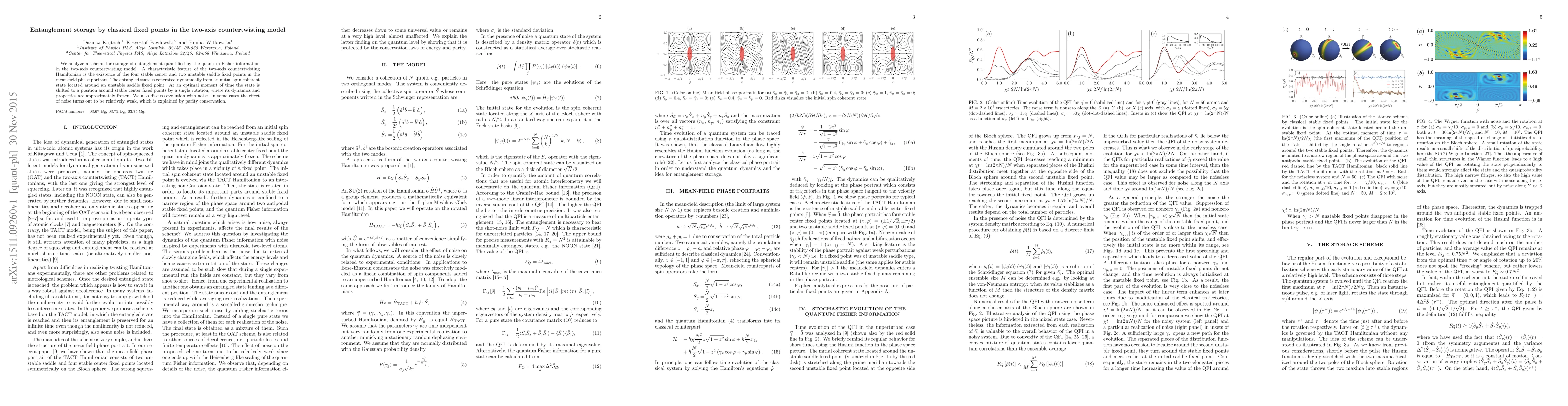 This paper explores entanglement storage in the two-axis countertwisting model using classical fixed points, where entanglement is quantified by quantum Fisher information. The system's dynamics shift from an unstable saddle to stable center fixed points via a single rotation, effectively freezing the entanglement, with noise effects often mitigated by parity conservation.
