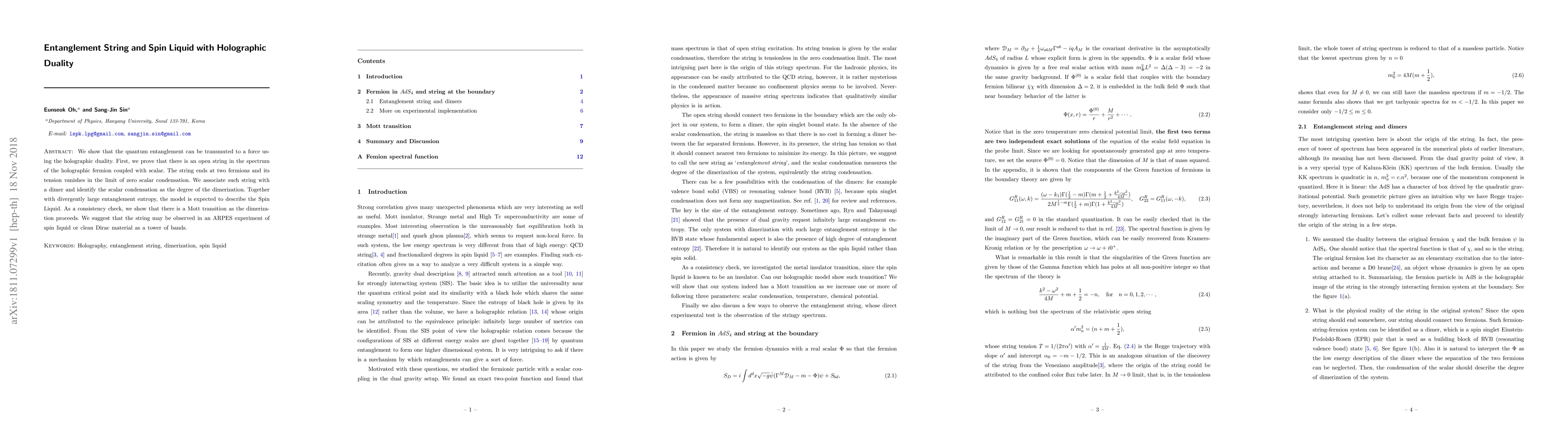 This paper demonstrates that quantum entanglement can be transformed into a force via holographic duality, identifying an open string in the spectrum of a holographic fermion coupled with a scalar. The study associates this string with a dimer and suggests that the model, characterized by large entanglement entropy, describes a Spin Liquid, with a Mott transition observed during dimerization.