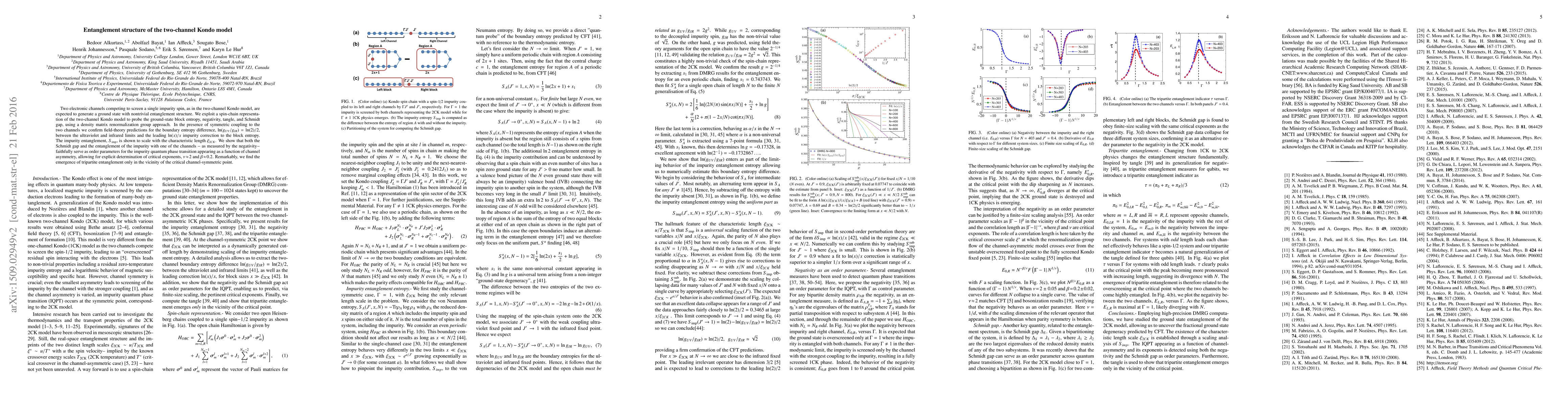 Two electronic channels competing to screen a single impurity spin, as in the two-channel Kondo model, are expected to generate a ground state with nontrivial entanglement structure. We exploit a spin-chain representation of the two-channel Kondo model to probe the ground-state block entropy, negativity, tangle, and Schmidt gap, using a density matrix renormalization group approach. In the presence of symmetric coupling to the two channels we confirm field-theory predictions for the boundary entropy difference, $\ln (g_{UV}/g_{IR})=\ln(2)/2$, between the ultraviolet and infrared limits and the leading $\ln(x)/x$ impurity correction to the block entropy. The impurity entanglement, $S_{\text{imp}}$, is shown to scale with the characteristic length $\xi_{2CK}$. We show that both the Schmidt gap and the entanglement of the impurity with one of the channels $-$ as measured by the negativity$-$ faithfully serve as order parameters for the impurity quantum phase transition appearing as a function of channel asymmetry, allowing for explicit determination of critical exponents, $\nu\!\approx\! 2$ and $\beta \!\approx\! 0.2$. Remarkably, we find the emergence of tripartite entanglement only in the vicinity of the critical channel-symmetric point.