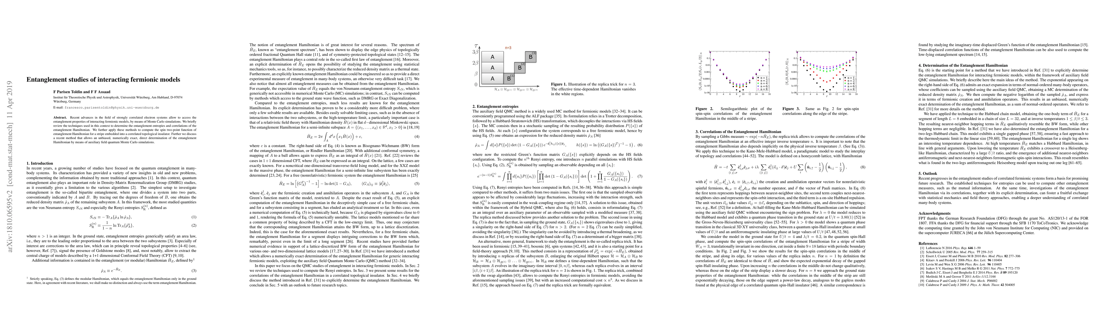 Recent advances in the field of strongly correlated electron systems allow to access the entanglement properties of interacting fermionic models, by means of Monte Carlo simulations. We briefly review the techniques used in this context to determine the entanglement entropies and correlations of the entanglement Hamiltonian. We further apply these methods to compute the spin two-point function of entanglement Hamiltonian for a stripe embedded into a correlated topological insulator. Further we discuss a recent method that allows an unbiased, numerically exact, direct determination of the entanglement Hamiltonian by means of auxiliary field quantum Monte Carlo simulations.