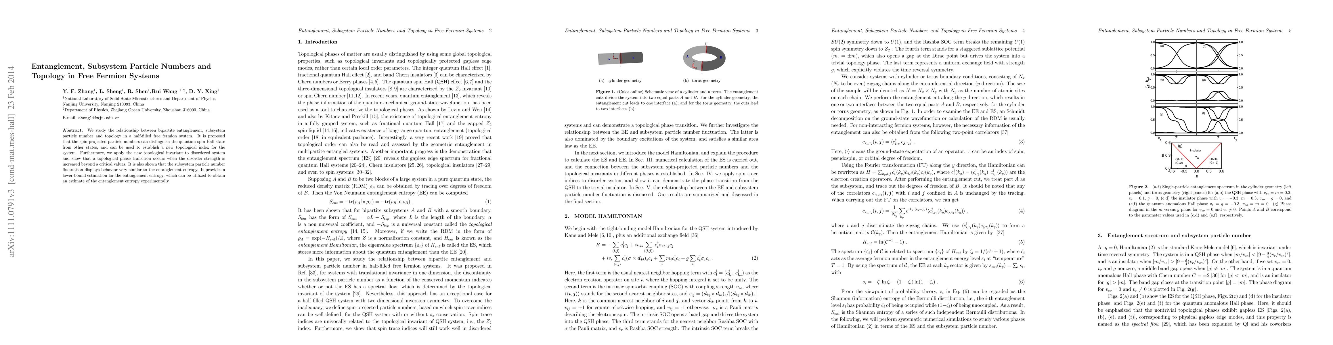 This paper investigates the interplay between bipartite entanglement, subsystem particle numbers, and topology in half-filled free fermion systems. It proposes using spin-projected particle numbers to distinguish quantum spin Hall states and establishes a new topological index, demonstrating a topological phase transition with increasing disorder. Additionally, it finds that subsystem particle number fluctuations correlate closely with entanglement entropy, providing a method for estimating entanglement entropy experimentally.