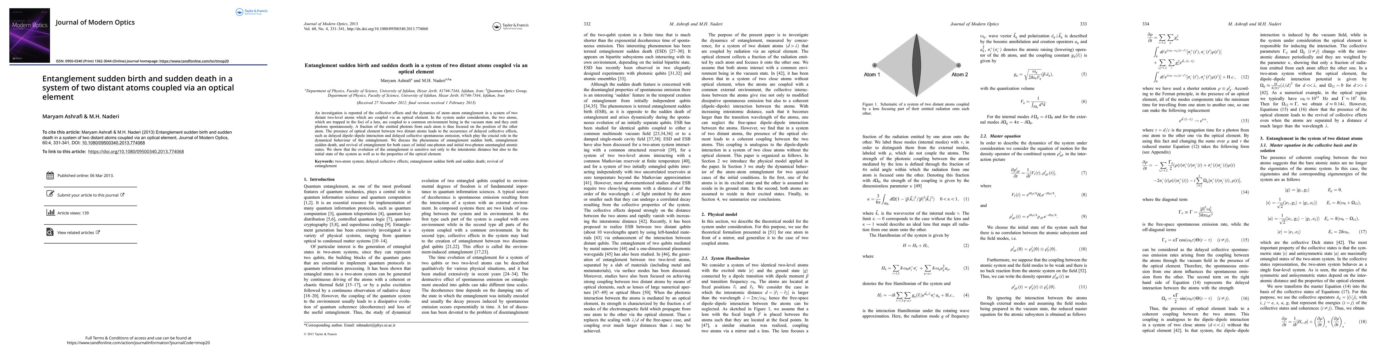 This paper investigates the dynamics of entanglement between two distant atoms coupled via an optical element, focusing on phenomena such as entanglement sudden birth and death. The study reveals that the evolution of entanglement is influenced by the interatomic distance, initial atomic states, and optical element properties.