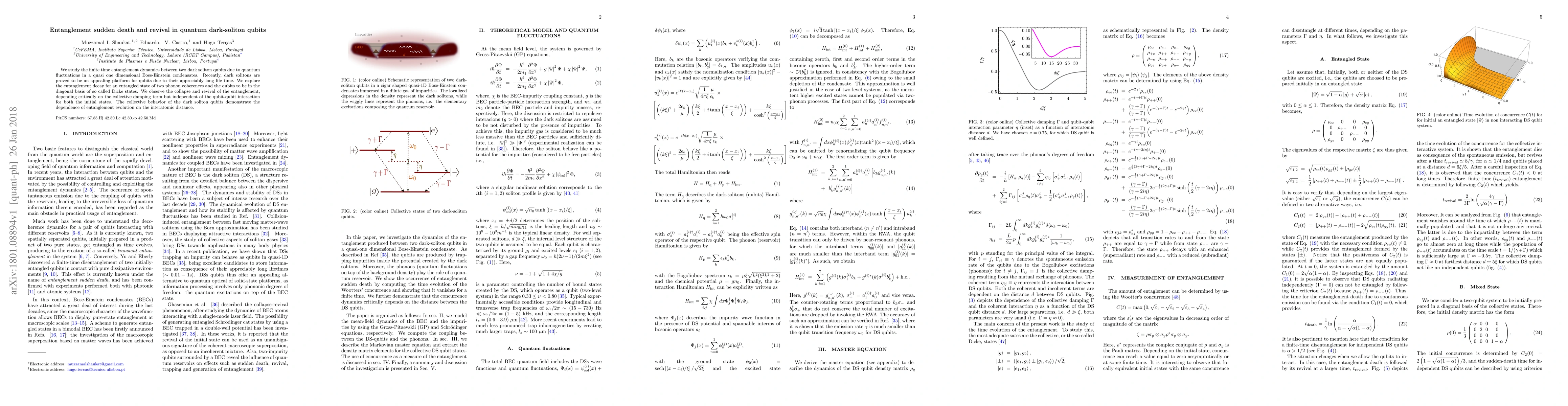 This paper investigates the dynamics of entanglement between two dark soliton qubits in a quasi one-dimensional Bose-Einstein condensate, revealing entanglement sudden death and revival influenced by quantum fluctuations and the collective damping term, rather than qubit-qubit interaction. The study highlights the dependence of entanglement evolution on interatomic distance.