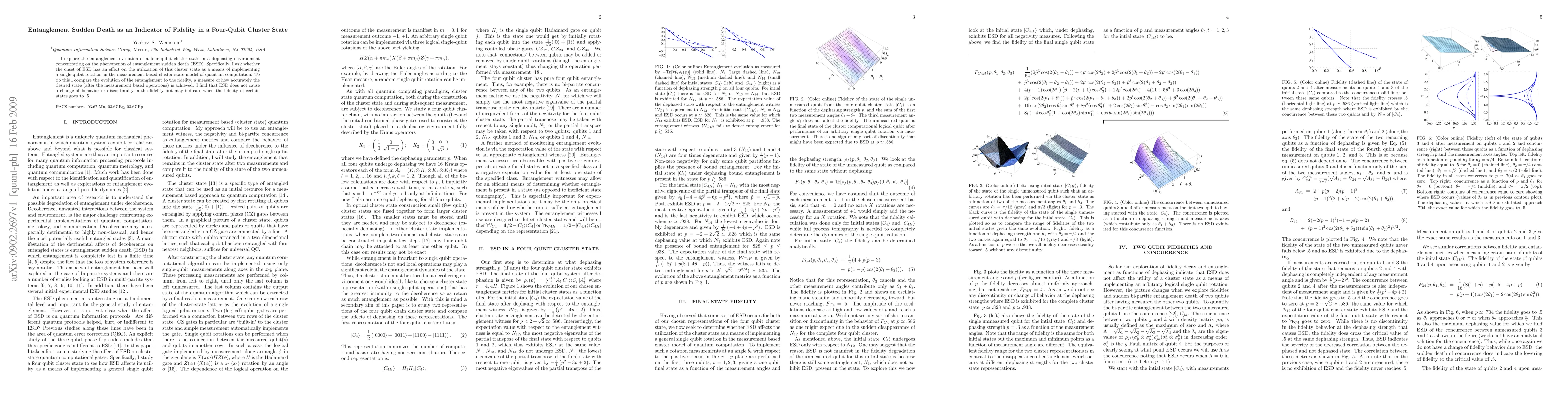 I explore the entanglement evolution of a four qubit cluster state in a dephasing environment concentrating on the phenomenon of entanglement sudden death (ESD). Specifically, I ask whether the onset of ESD has an effect on the utilization of this cluster state as a means of implementing a single qubit rotation in the measurement based cluster state model of quantum computation. To do this I compare the evolution of the entanglement to the fidelity, a measure of how accurately the desired state (after the measurement based operations) is achieved. I find that ESD does not cause a change of behavior or discontinuity in the fidelity but may indicate when the fidelity of certain states goes to .5.