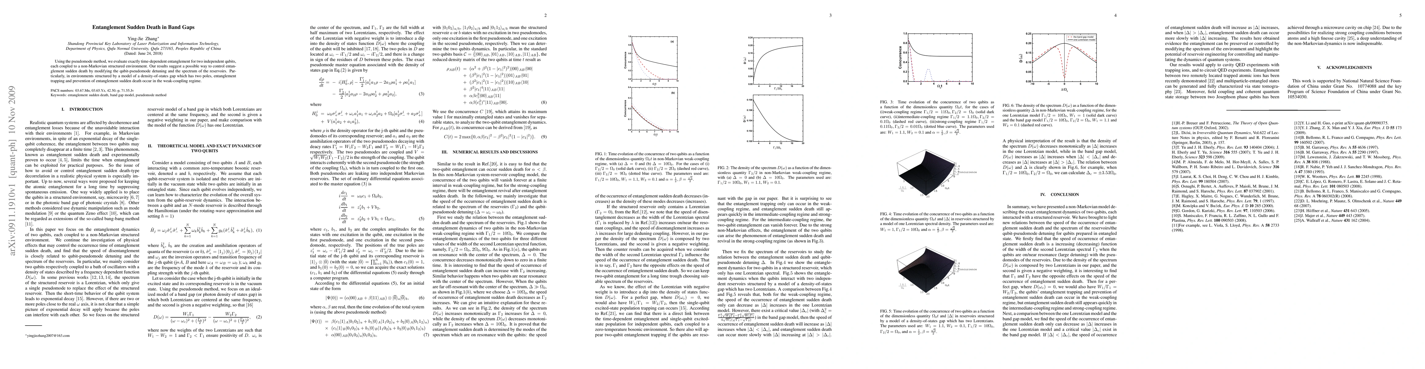 Using the pseudomode method, we evaluate exactly time-dependent entanglement for two independent qubits, each coupled to a non-Markovian structured environment. Our results suggest a possible way to control entanglement sudden death by modifying the qubit-pseudomode detuning and the spectrum of the reservoirs. Particularly, in environments structured by a model of a density-of-states gap which has two poles, entanglement trapping and prevention of entanglement sudden death occur in the weak-coupling regime.