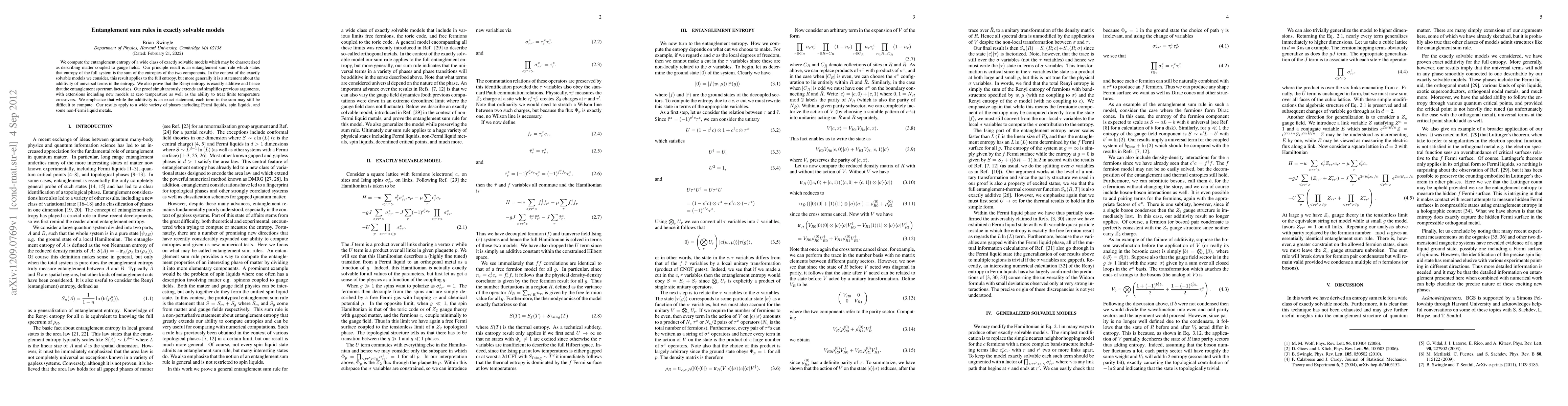 This paper establishes an entanglement sum rule for exactly solvable models of matter coupled to gauge fields, showing that the full system's entropy is the sum of the individual components' entropies. The authors prove the exact additivity of Renyi entropy and factorization of the entanglement spectrum, extending previous arguments to include new models and finite temperature crossovers.