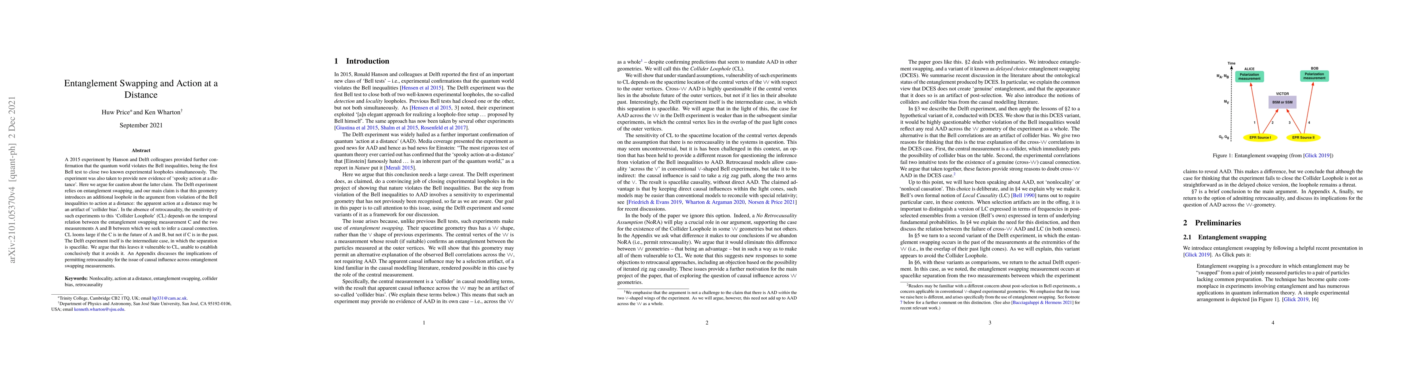 A 2015 experiment by Hanson and Delft colleagues provided further confirmation that the quantum world violates the Bell inequalities, being the first Bell test to close two known experimental loopholes simultaneously. The experiment was also taken to provide new evidence of 'spooky action at a distance'. Here we argue for caution about the latter claim. The Delft experiment relies on entanglement swapping, and our main claim is that this geometry introduces an additional loophole in the argument from violation of the Bell inequalities to action at a distance: the apparent action at a distance may be an artifact of 'collider bias'. In the absence of retrocausality, the sensitivity of such experiments to this 'Collider Loophole' (CL) depends on the temporal relation between the entanglement swapping measurement C and the two measurements A and B between which we seek to infer a causal connection. CL looms large if the C is in the future of A and B, but not if C is in the past. The Delft experiment itself is the intermediate case, in which the separation is spacelike. We argue that this leaves it vulnerable to CL, unable to establish conclusively that it avoids it. An Appendix discusses the implications of permitting retrocausality for the issue of causal influence across entanglement swapping measurements.