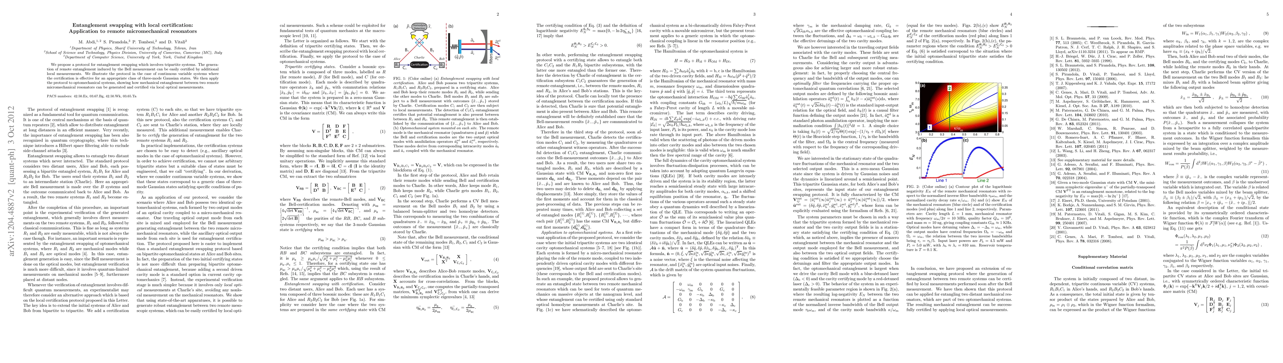 This paper proposes a protocol for entanglement swapping using tripartite systems, enabling the generation and local certification of remote entanglement. The method is demonstrated for continuous variable systems and applied to optomechanical systems to generate and certify mechanical entanglement between two remote micromechanical resonators.