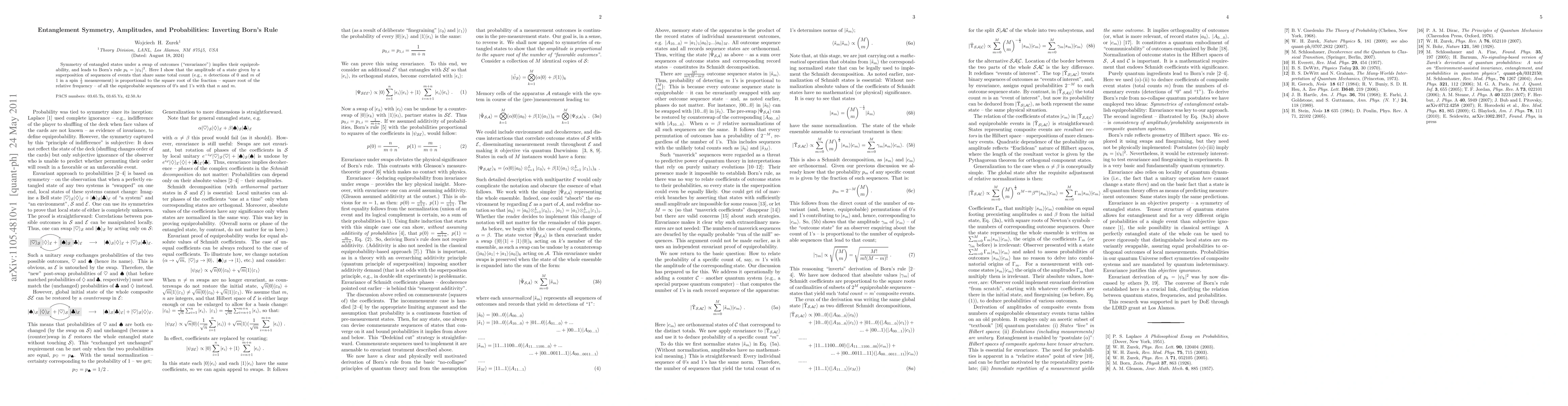 The paper demonstrates that entanglement symmetry, or "envariance," under outcome swapping leads to Born's rule. It proposes a method to calculate state amplitudes based on the square root of the relative frequency of equiprobable sequences in quantum measurements.