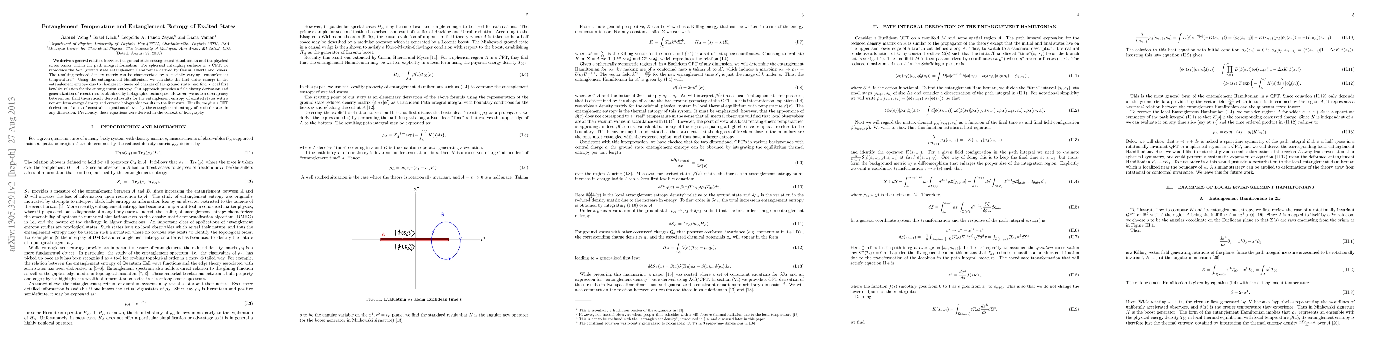 We derive a general relation between the ground state entanglement Hamiltonian and the physical stress tensor within the path integral formalism. For spherical entangling surfaces in a CFT, we reproduce the \emph{local} ground state entanglement Hamiltonian derived by Casini, Huerta and Myers. The resulting reduced density matrix can be characterized by a spatially varying "entanglement temperature." Using the entanglement Hamiltonian, we calculate the first order change in the entanglement entropy due to changes in conserved charges of the ground state, and find a local first law-like relation for the entanglement entropy. Our approach provides a field theory derivation and generalization of recent results obtained by holographic techniques. However, we note a discrepancy between our field theoretically derived results for the entanglement entropy of excited states with a non-uniform energy density and current holographic results in the literature. Finally, we give a CFT derivation of a set of constraint equations obeyed by the entanglement entropy of excited states in any dimension. Previously, these equations were derived in the context of holography.