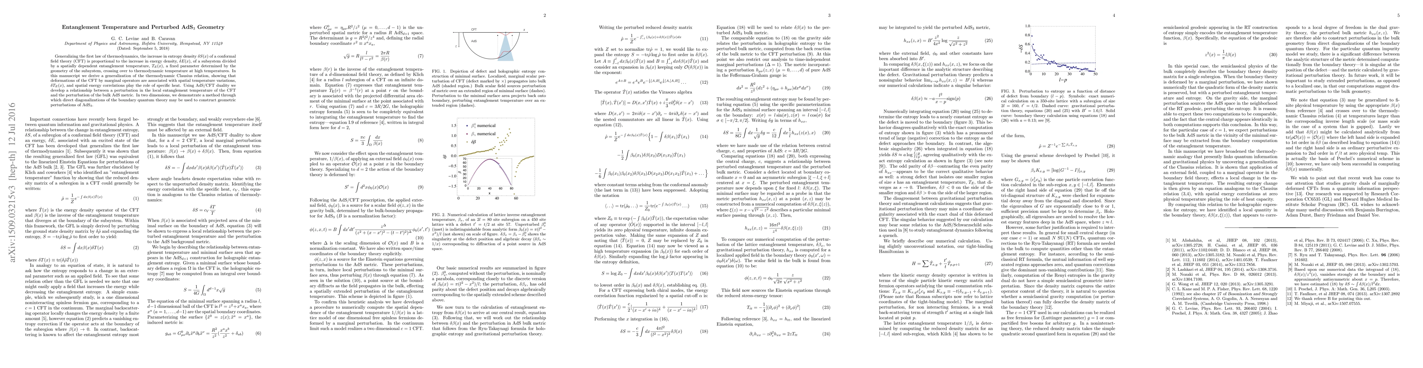 In analogy to the first law of thermodynamics, the increase in entanglement entropy $\delta S$ of a conformal field theory (CFT) is proportional to the increase in energy, $\delta E$, of the subsystem divided by an effective entanglement temperature, $T_E$. Extending this analogy, we study entanglement entropy when the subsystem is perturbed by applying an external field, expressed as a coupling to a local marginal operator in the CFT. We show that the resulting entropy change is associated with a change in the entanglement temperature itself, leading to an equation analogous to the Clausius relation. Using AdS/CFT duality we develop a relationship between a perturbation in the local entanglement temperature, $\delta T_E(x)$ of the CFT and the perturbation of the bulk AdS metric. Using the AdS$_3$ minimal surface as a probe, we can construct bulk metric perturbations from an exact numerical computation of the entanglement temperature in a two dimensional $c=1$ boundary theory deformed by a marginal perturbation.