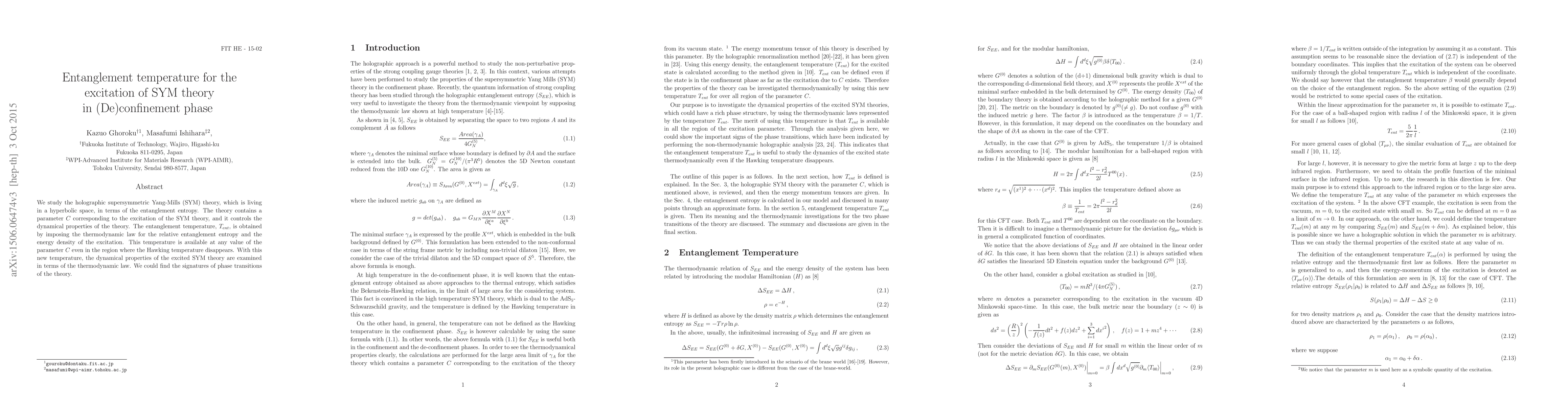 We study the holographic supersymmetric Yang-Mills (SYM) theory, which is living in a hyperbolic space, in terms of the entanglement entropy. The theory contains a parameter ($C$) corresponding to the excitation of the SYM theory, and it controls the dynamical properties of the theory. The entanglement temperature ($T_{ent}$) is obtained by imposing the thermodynamic law for the relative entanglement entropy and the energy density of the excitation. This temperature is available at any value of the parameter $C$ even in the region where the Hawking temperature disappears. With this new temperature, the dynamical properties of the excited SYM theory are examined in terms of the thermodynamic law. We could find the signatures of phase transitions of the theory.