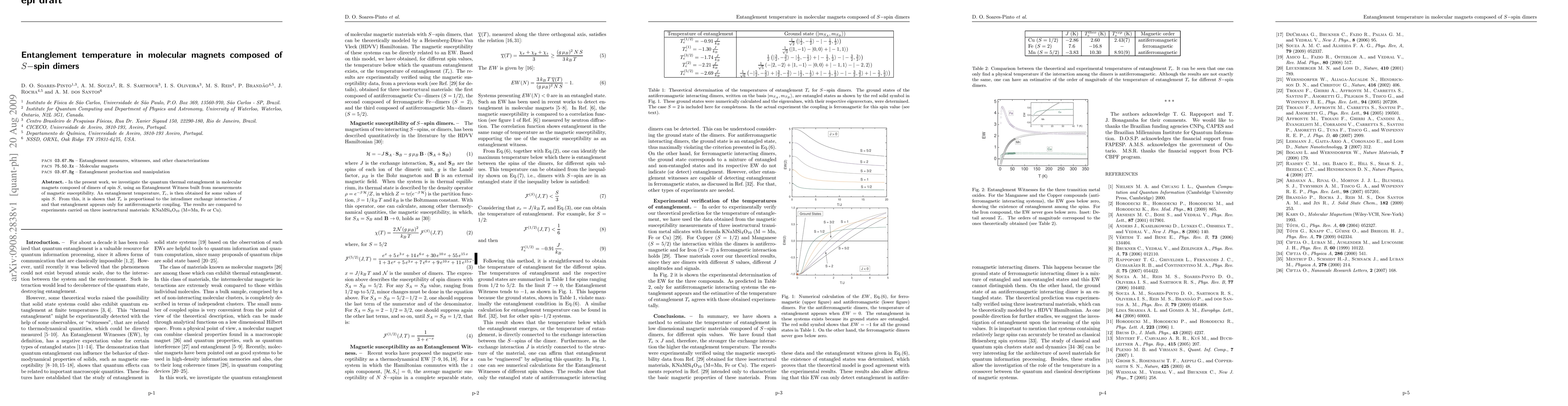 Researchers investigated entanglement temperature in molecular magnets composed of S-spin dimers and found it to be proportional to the intradimer exchange interaction J, with entanglement only appearing for antiferromagnetic coupling.