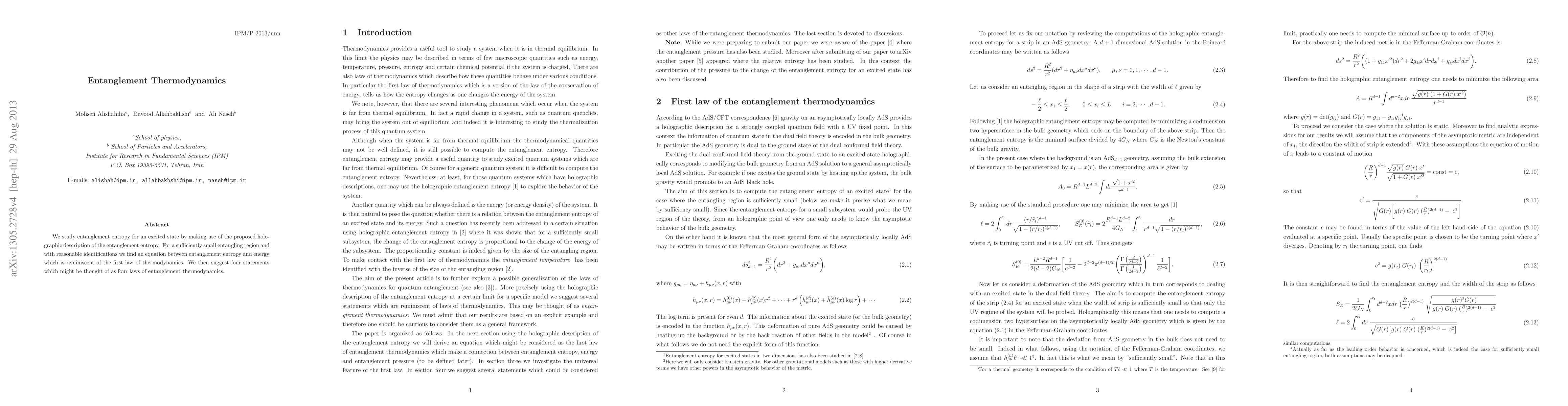 This paper explores the entanglement entropy of an excited state using a holographic description, revealing an equation linking entanglement entropy and energy akin to the first law of thermodynamics, and proposes four potential laws of entanglement thermodynamics.
