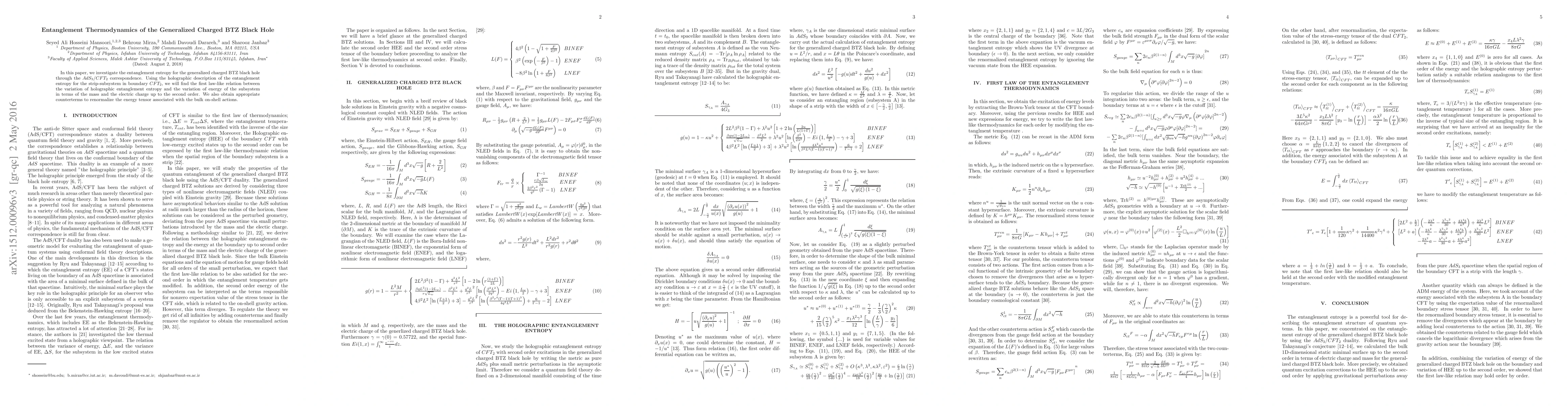 This paper explores the entanglement entropy of a generalized charged BTZ black hole via the AdS₃/CFT₂ correspondence, deriving a first law-like relation between the holographic entanglement entropy and the subsystem's energy in terms of its mass and charge. It also includes renormalization procedures for the bulk energy tensor.