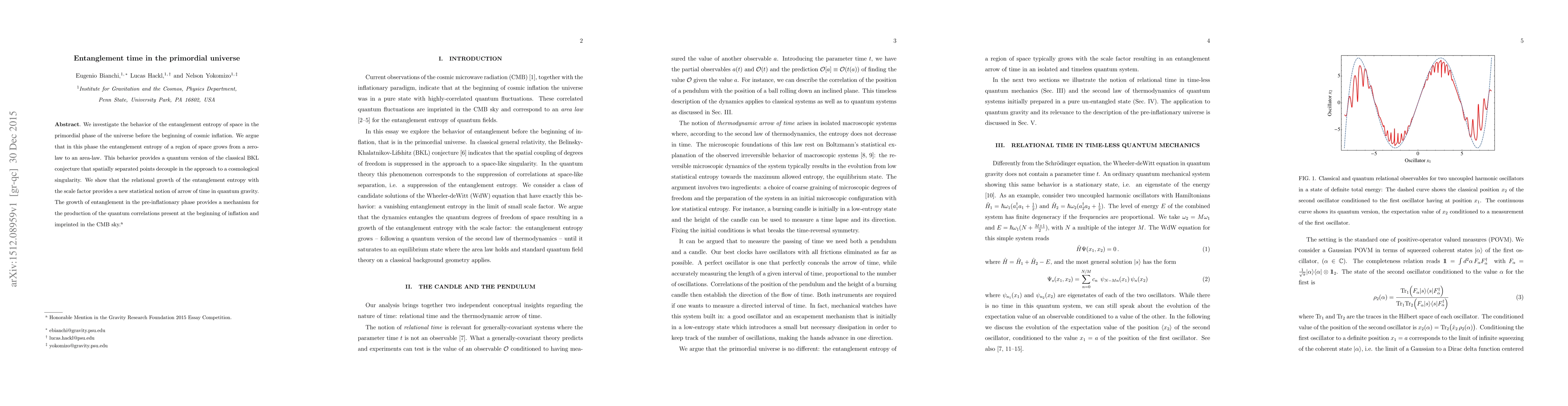 We investigate the behavior of the entanglement entropy of space in the primordial phase of the universe before the beginning of cosmic inflation. We argue that in this phase the entanglement entropy of a region of space grows from a zero-law to an area-law. This behavior provides a quantum version of the classical BKL conjecture that spatially separated points decouple in the approach to a cosmological singularity. We show that the relational growth of the entanglement entropy with the scale factor provides a new statistical notion of arrow of time in quantum gravity. The growth of entanglement in the pre-inflationary phase provides a mechanism for the production of the quantum correlations present at the beginning of inflation and imprinted in the CMB sky.