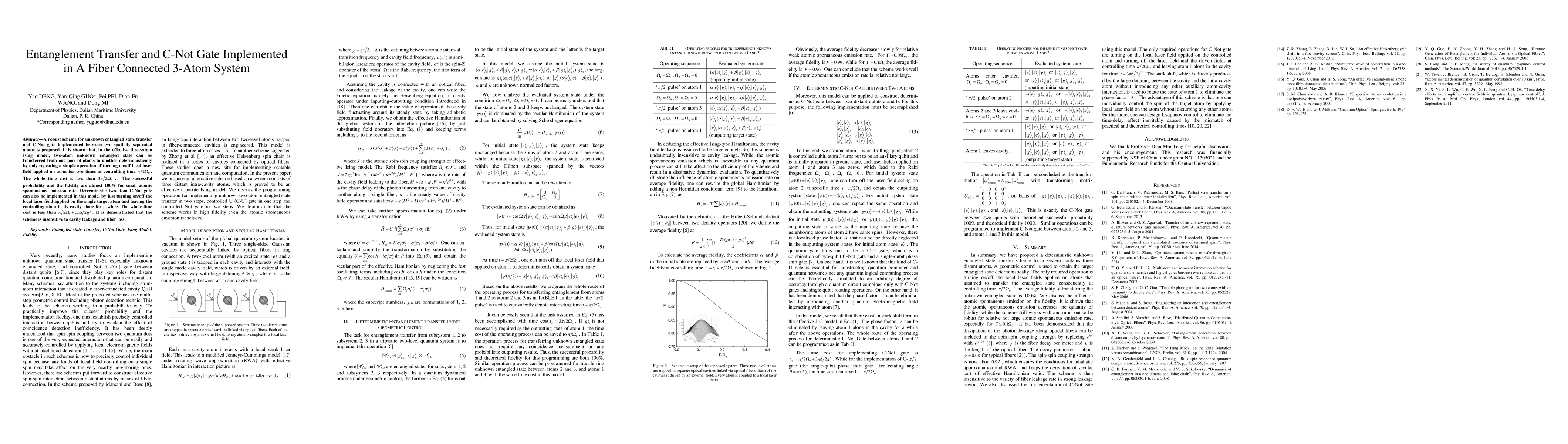 This paper proposes a robust scheme for transferring unknown entangled states and implementing a C-Not gate in a fiber-connected three-atom system, achieving nearly 100% fidelity with minimal time cost and insensitivity to cavity leakage and fiber loss. The method involves simple local laser field operations on the atoms.
