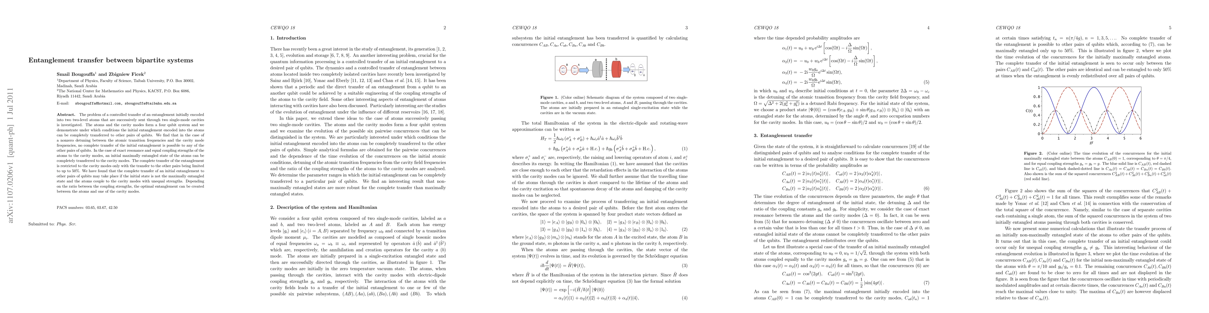 This paper investigates the controlled transfer of entanglement between two pairs of qubits formed by two-level atoms and single-mode cavity modes. It finds that complete entanglement transfer is only possible under exact resonance and equal coupling strengths, while unequal coupling strengths can lead to partial transfers and optimal entanglement creation between specific qubits.