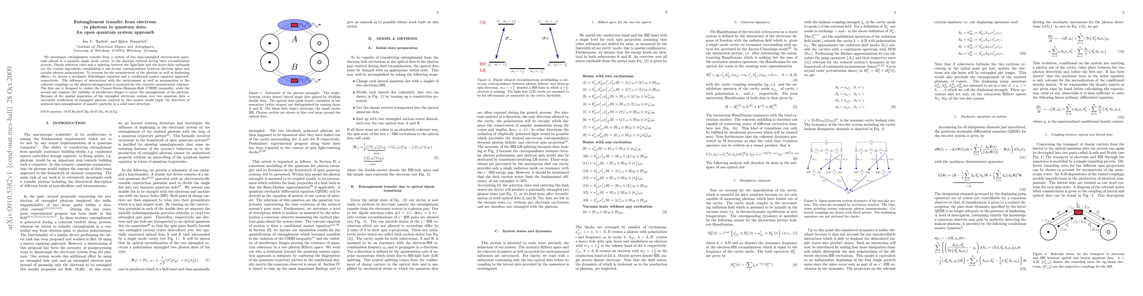 We investigate entanglement transfer from a system of two spin-entangled electron-hole pairs, each placed in a separate single mode cavity, to the photons emitted during their recombination process. Dipole selection rules and a splitting between the light-hole and the heavy-hole subbands are the crucial ingredients establishing a one-to-one correspondence between electron spins and circular photon polarizations. To account for the measurement of the photons as well as dephasing effects, we choose a stochastic Schroedinger equation and a conditional master equation approach, respectively. The influence of interactions with the environment as well as asymmetries in the coherent couplings on the photon-entanglement is analyzed for two concrete measurement schemes. The first one is designed to violate the Clauser-Horne-Shimony-Holt (CHSH) inequality, while the second one employs the visibility of interference fringes to prove the entanglement of the photons. Because of the spatial separation of the entangled electronic system over two quantum dots, a successful verification of entangled photons emitted by this system would imply the detection of nonlocal spin-entanglement of massive particles in a solid state structure.
