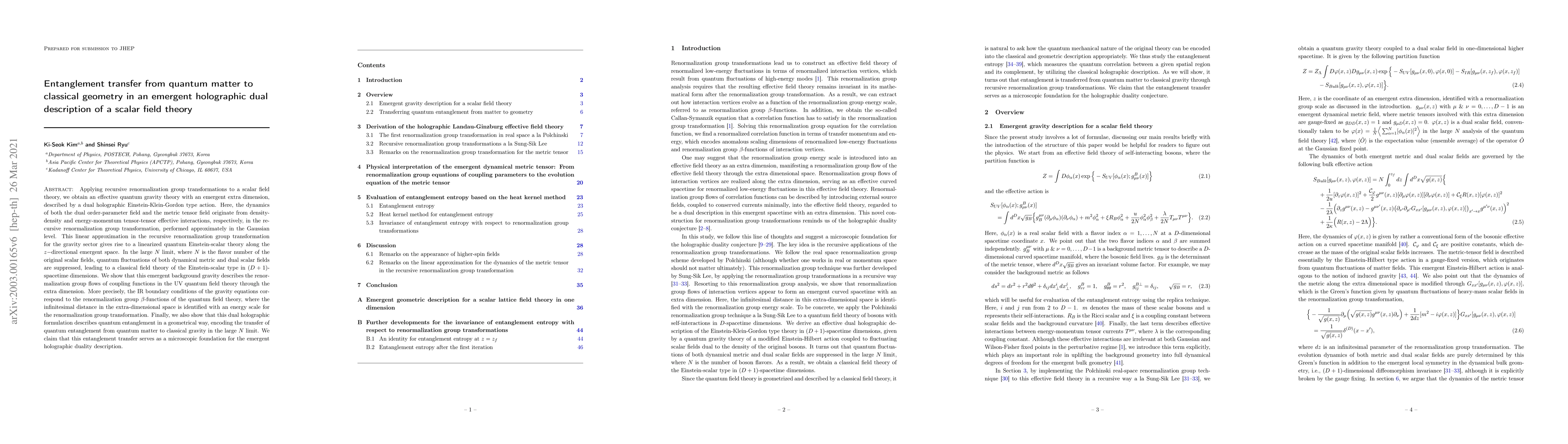 This paper explores the emergence of an extra dimension in a scalar field theory via recursive renormalization group transformations, leading to an effective quantum gravity theory described by a holographic Einstein-Klein-Gordon action. It demonstrates that this emergent classical gravity captures the renormalization group flows and geometrically encodes the transfer of quantum entanglement from matter to classical geometry in the large $N$ limit.