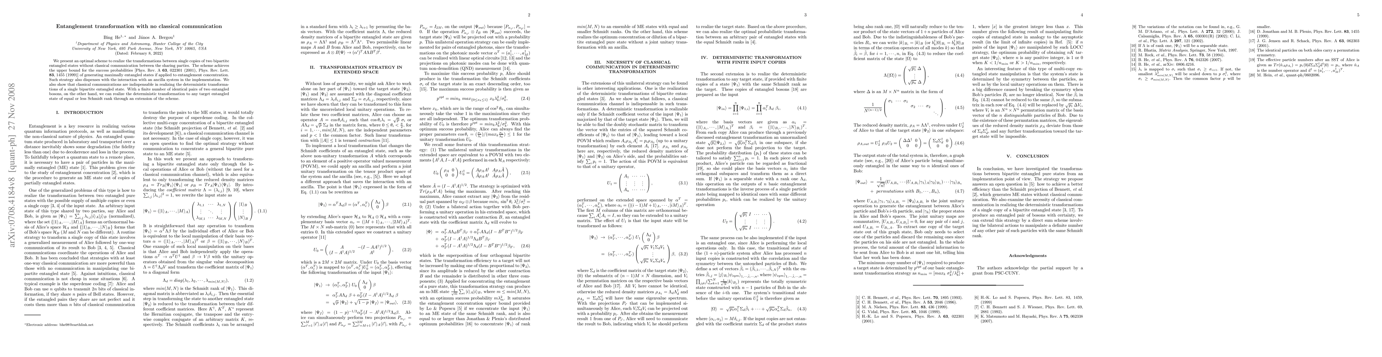 We present an optimal scheme to realize the transformations between single copies of two bipartite entangled states without classical communication between the sharing parties. The scheme achieves the upper bound for the success probabilities [PRA 63, 022301 (2001), PRL 83, 1455 (1999)] of generating maximally entangled states if applied to entanglement concentration. Such strategy also dispenses with the interaction with an ancilla system in the implementation. We also show that classical communications are indispensable in realizing the deterministic transformations of a single bipartite entangled state. With a finite number of identical pairs of two entangled bosons, on the other hand, we can realize the deterministic transformation to any target entangled state of equal or less Schmidt rank through an extension of the scheme.