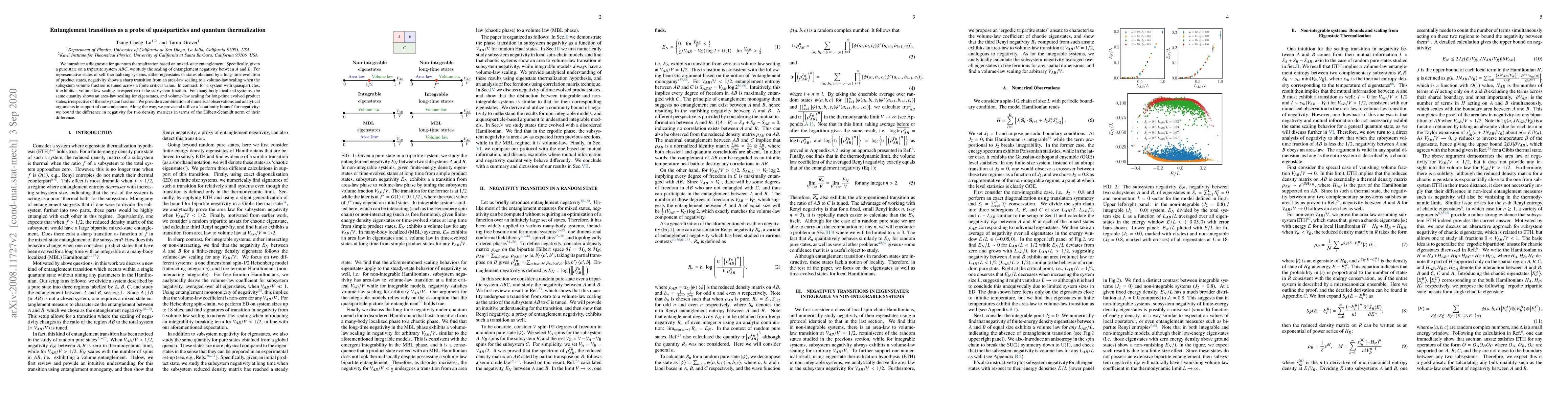 We introduce a diagnostic for quantum thermalization based on mixed-state entanglement. Specifically, given a pure state on a tripartite system $ABC$, we study the scaling of entanglement negativity between $A$ and $B$. For representative states of self-thermalizing systems, either eigenstates or states obtained by a long-time evolution of product states, negativity shows a sharp transition from an area-law scaling to a volume-law scaling when the subsystem volume fraction is tuned across a finite critical value. In contrast, for a system with quasiparticles, it exhibits a volume-law scaling irrespective of the subsystem fraction. For many-body localized systems, the same quantity shows an area-law scaling for eigenstates, and volume-law scaling for long-time evolved product states, irrespective of the subsystem fraction. We provide a combination of numerical observations and analytical arguments in support of our conjecture. Along the way, we prove and utilize a `continuity bound' for negativity: we bound the difference in negativity for two density matrices in terms of the Hilbert-Schmidt norm of their difference.