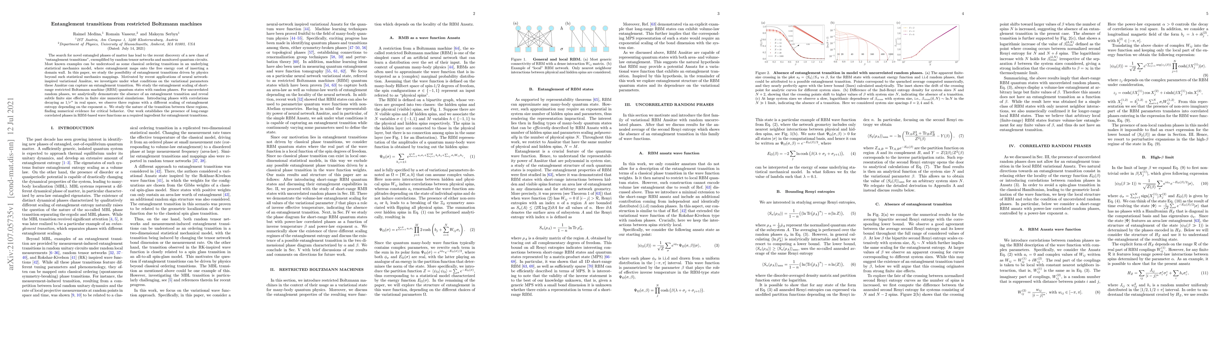 The search for novel entangled phases of matter has lead to the recent discovery of a new class of ``entanglement transitions'', exemplified by random tensor networks and monitored quantum circuits. Most known examples can be understood as some classical ordering transitions in an underlying statistical mechanics model, where entanglement maps onto the free energy cost of inserting a domain wall. In this paper, we study the possibility of entanglement transitions driven by physics beyond such statistical mechanics mappings. Motivated by recent applications of neural network-inspired variational Ans\"atze, we investigate under what conditions on the variational parameters these Ans\"atze can capture an entanglement transition. We study the entanglement scaling of short-range restricted Boltzmann machine (RBM) quantum states with random phases. For uncorrelated random phases, we analytically demonstrate the absence of an entanglement transition and reveal subtle finite size effects in finite size numerical simulations. Introducing phases with correlations decaying as $1/r^\alpha$ in real space, we observe three regions with a different scaling of entanglement entropy depending on the exponent $\alpha$. We study the nature of the transition between these regions, finding numerical evidence for critical behavior. Our work establishes the presence of long-range correlated phases in RBM-based wave functions as a required ingredient for entanglement transitions.