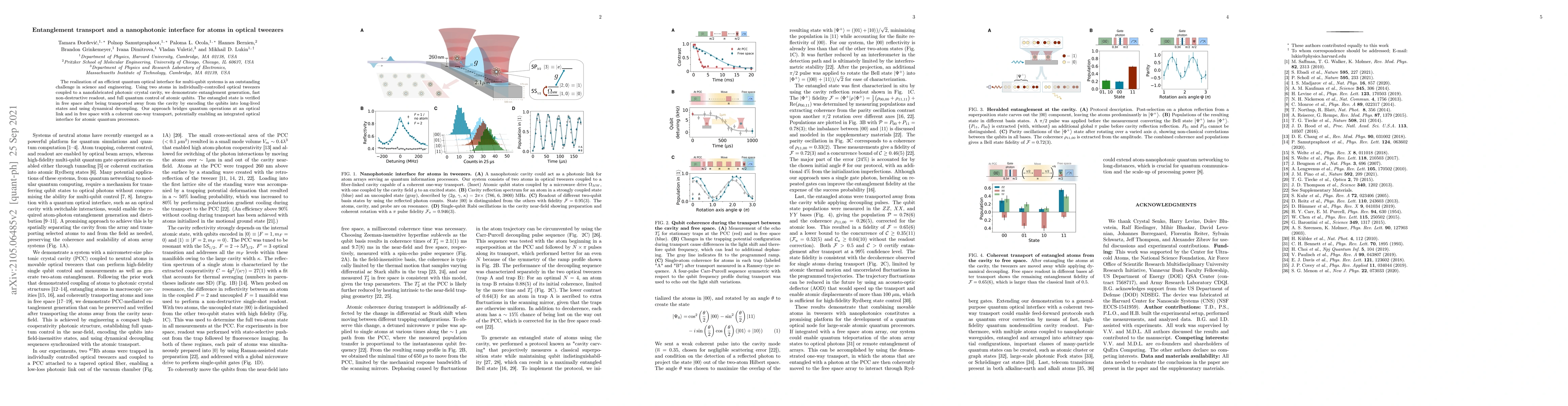 This paper demonstrates a quantum optical interface using two atoms in optical tweezers coupled to a photonic crystal cavity, enabling entanglement generation, fast readout, and quantum control. The entangled state is transported and verified in free space, bridging quantum operations with coherent one-way transport for potential integrated atomic quantum processors.
