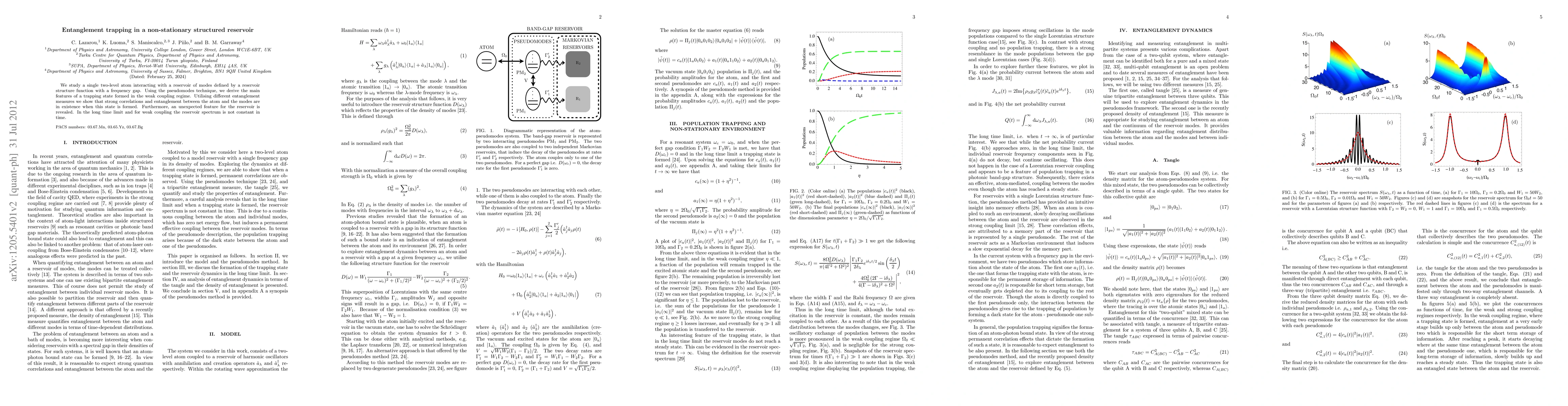 This paper explores entanglement trapping in a non-stationary structured reservoir where a two-level atom interacts with a reservoir of modes. It reveals strong correlations and entanglement in the weak coupling regime, and uncovers that the reservoir spectrum changes over time in the long term.