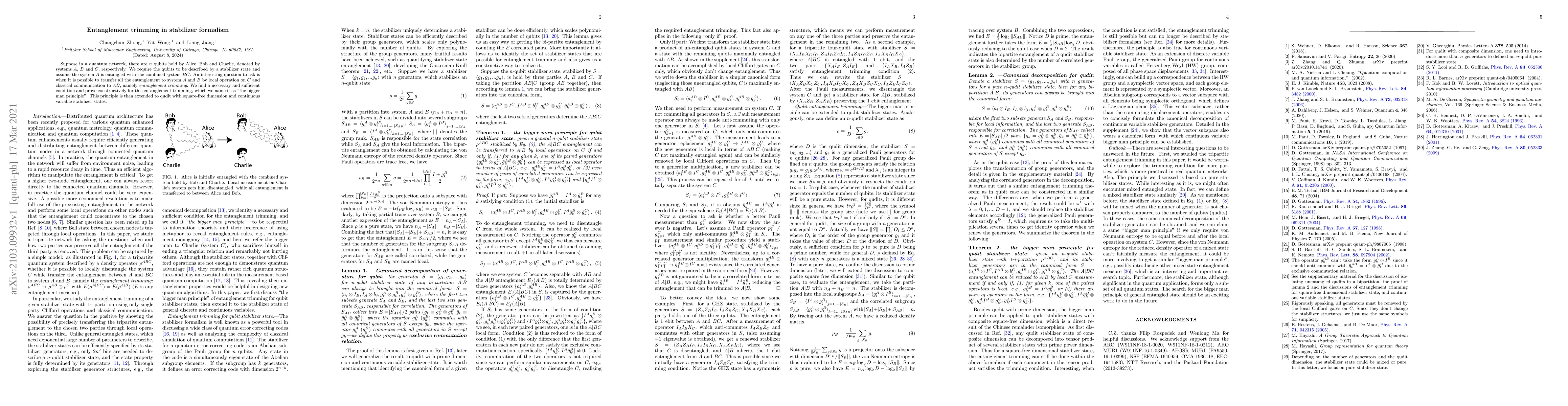 This paper explores entanglement trimming in quantum networks using the stabilizer formalism, identifying a necessary and sufficient condition for transferring all entanglement from a combined system to two subsystems through local operations on one subsystem and classical communication. The "bigger man principle" is proposed and extended to higher-dimensional qudits and continuous variable systems.