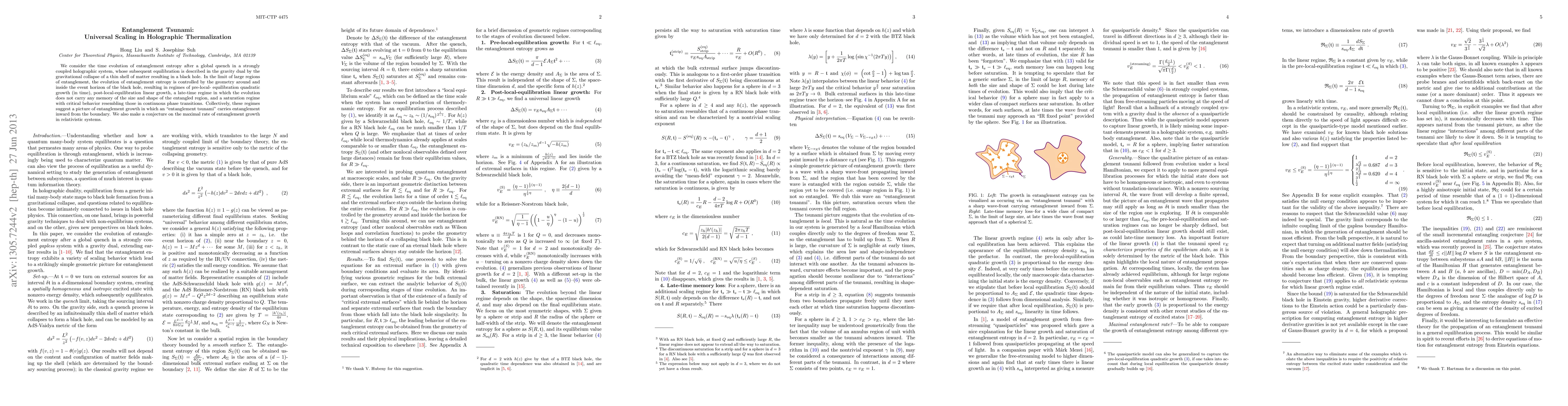 We consider the time evolution of entanglement entropy after a global quench in a strongly coupled holographic system, whose subsequent equilibration is described in the gravity dual by the gravitational collapse of a thin shell of matter resulting in a black hole. In the limit of large regions of entanglement, the evolution of entanglement entropy is controlled by the geometry around and inside the event horizon of the black hole, resulting in regimes of pre-local- equilibration quadratic growth (in time), post-local-equilibration linear growth, a late-time regime in which the evolution does not carry any memory of the size and shape of the entangled region, and a saturation regime with critical behavior resembling those in continuous phase transitions. Collectively, these regimes suggest a picture of entanglement growth in which an "entanglement tsunami" carries entanglement inward from the boundary. We also make a conjecture on the maximal rate of entanglement growth in relativistic systems.