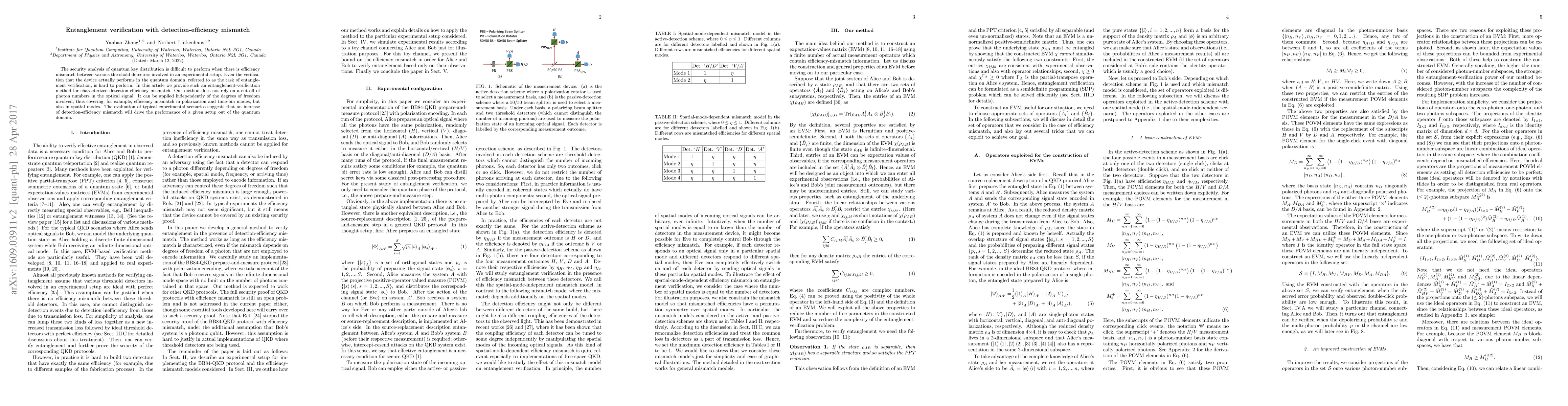 The security analysis of quantum key distribution is difficult to perform when there is efficiency mismatch between various threshold detectors involved in an experimental setup. Even the verification that the device actually performs in the quantum domain, referred to as the task of entanglement verification, is hard to perform. In this article we provide such an entanglement-verification method for characterized detection-efficiency mismatch. Our method does not rely on a cut-off of photon numbers in the optical signal. It can be applied independently of the degrees of freedom involved, thus covering, for example, efficiency mismatch in polarization and time-bin modes, but also in spatial modes. The evaluation of typical experimental scenarios suggests that an increase of detection-efficiency mismatch will drive the performance of a given setup out of the quantum domain.